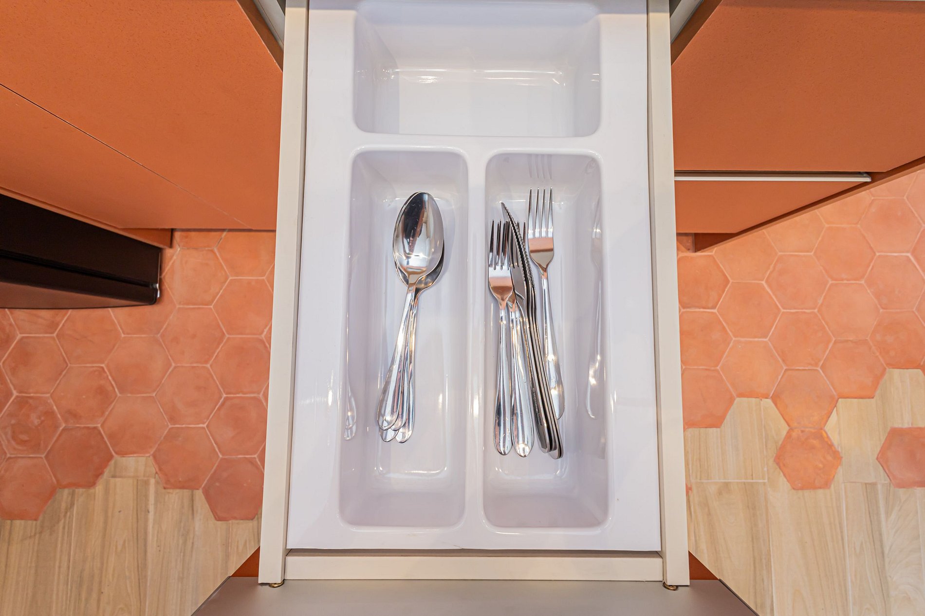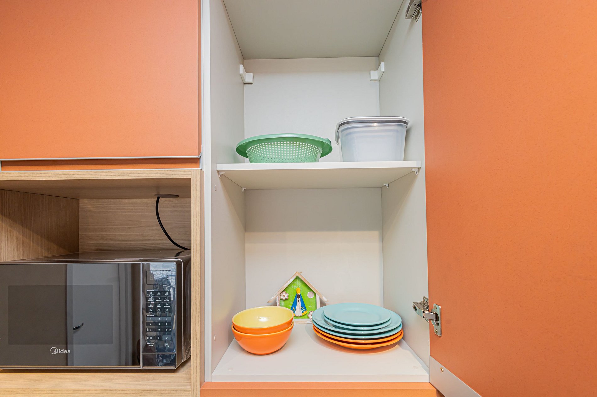 • Cozinha compacta e eficiente: Equipada com micro-ondas, fogão, geladeira e todos os utensílios necessários para preparar refeições rápidas e práticas.