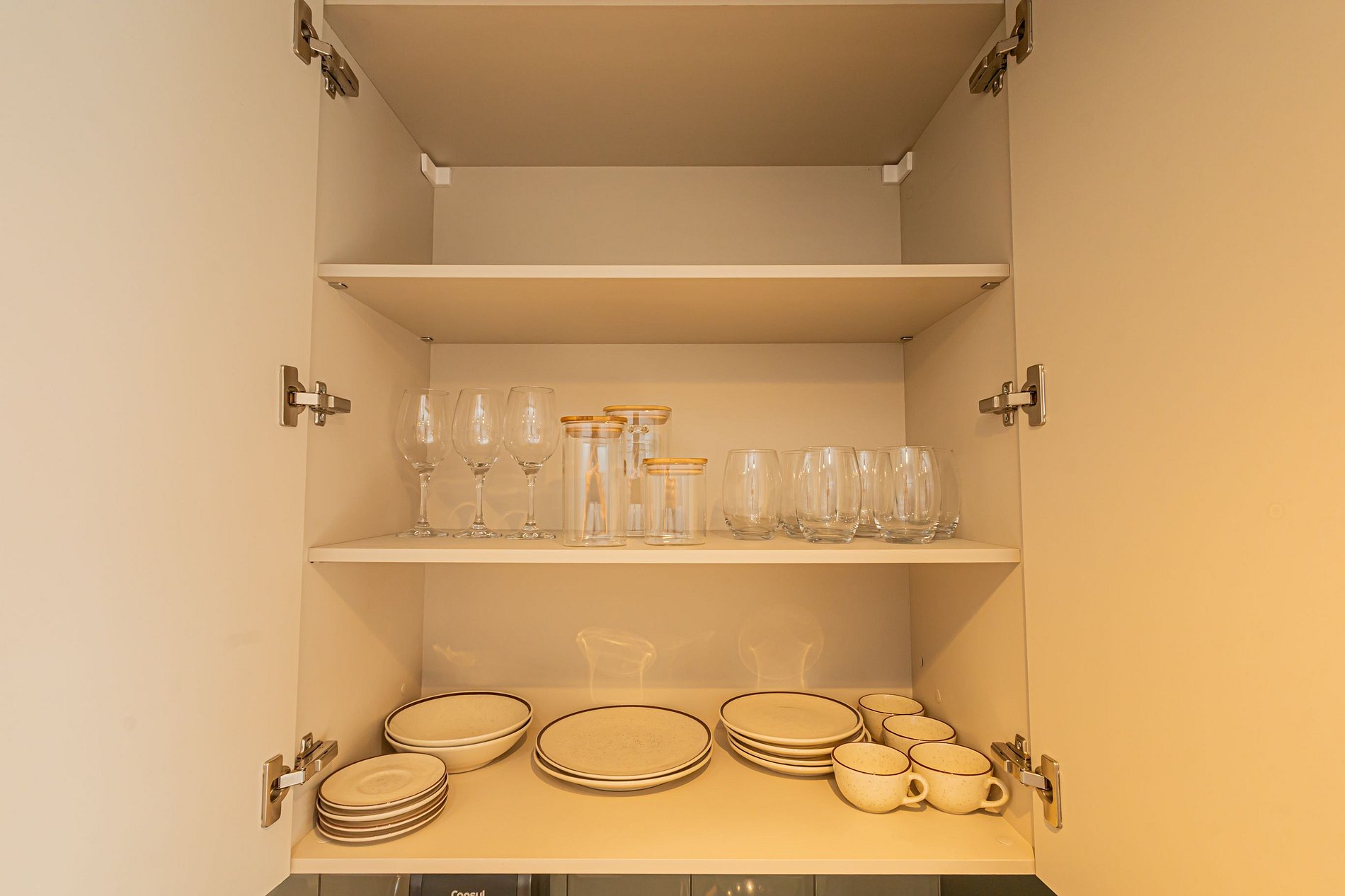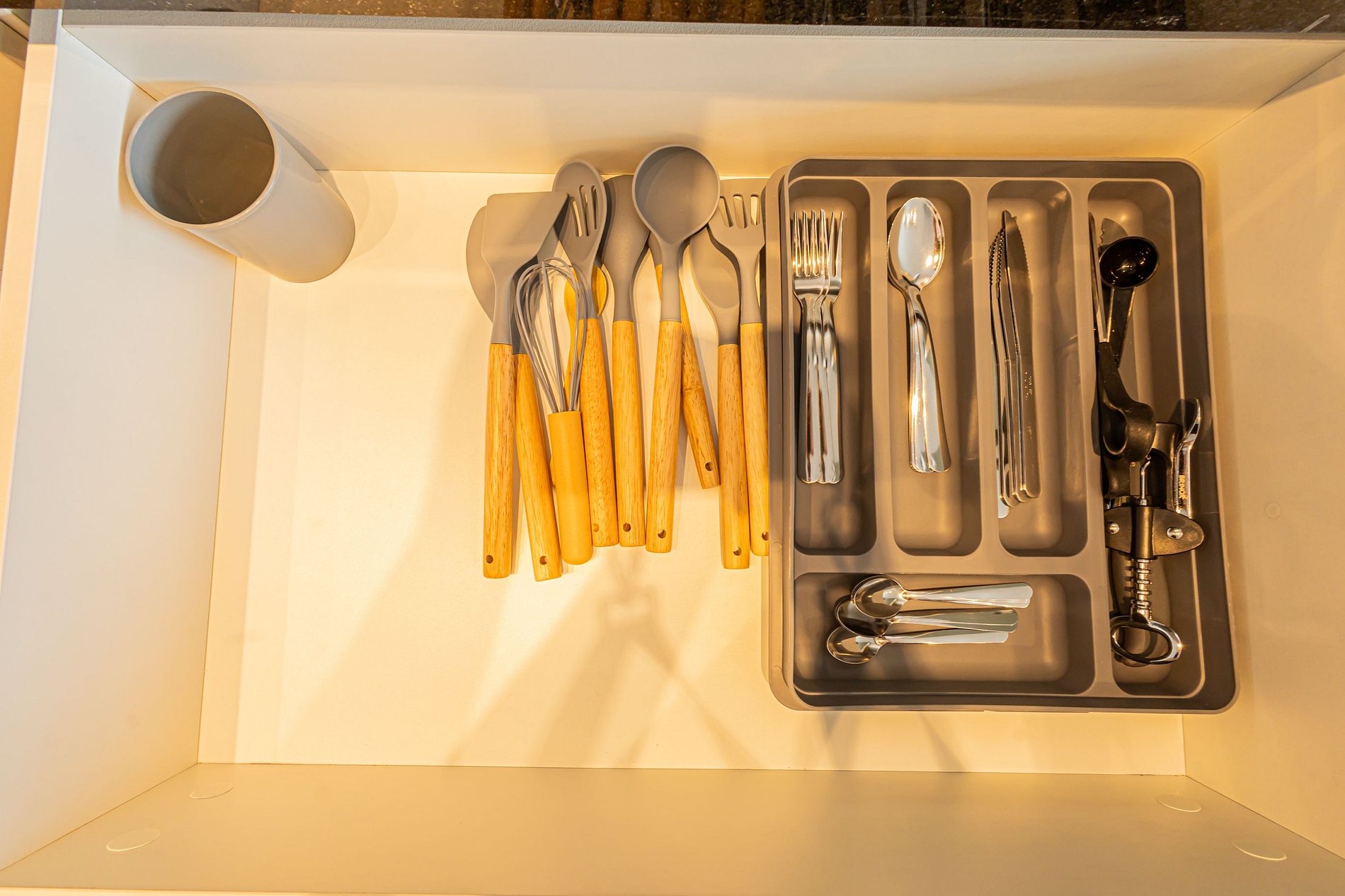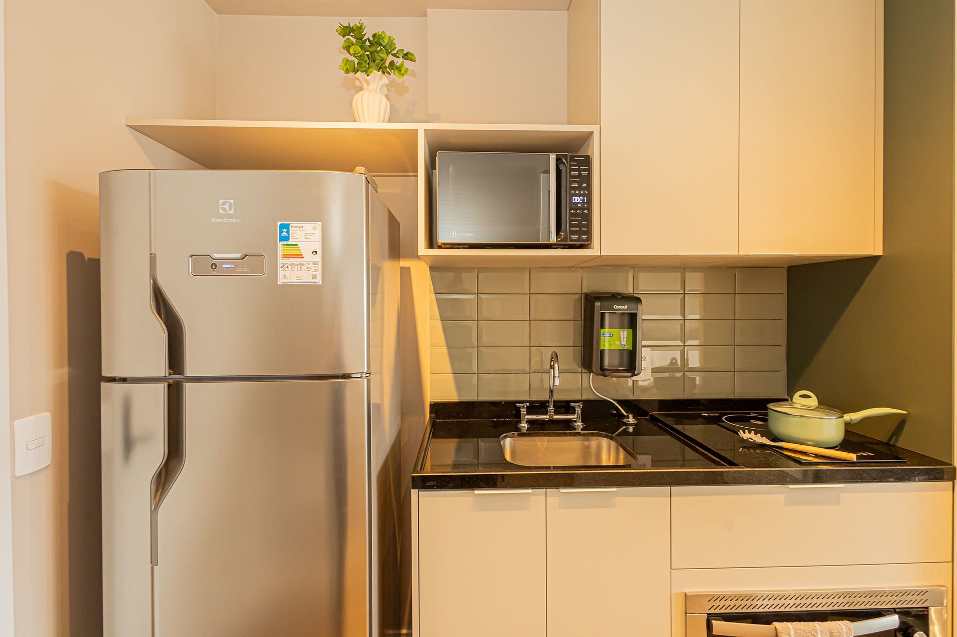 • Cozinha funcional: Equipada com micro-ondas, fogão, geladeira e todos os utensílios essenciais para preparar refeições rápidas e práticas.