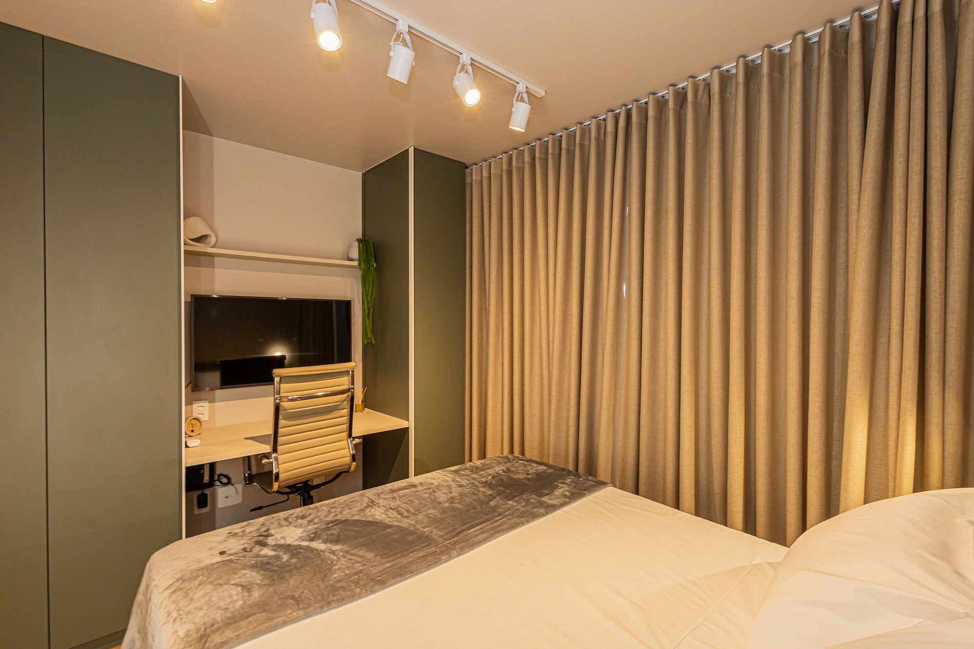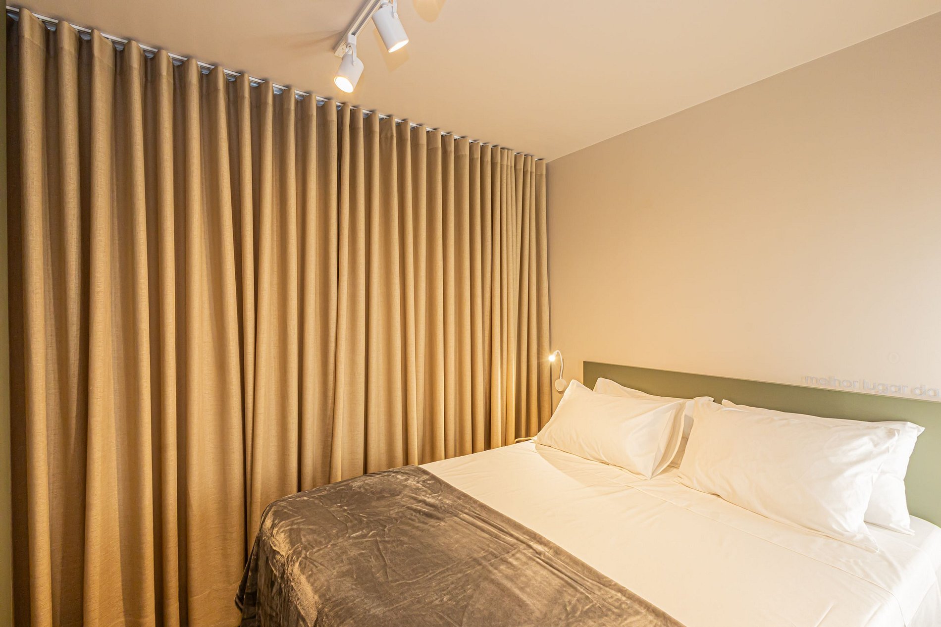 • Conforto superior: Quarto com cortinas blackout, proporcionando noites de sono tranquilas.