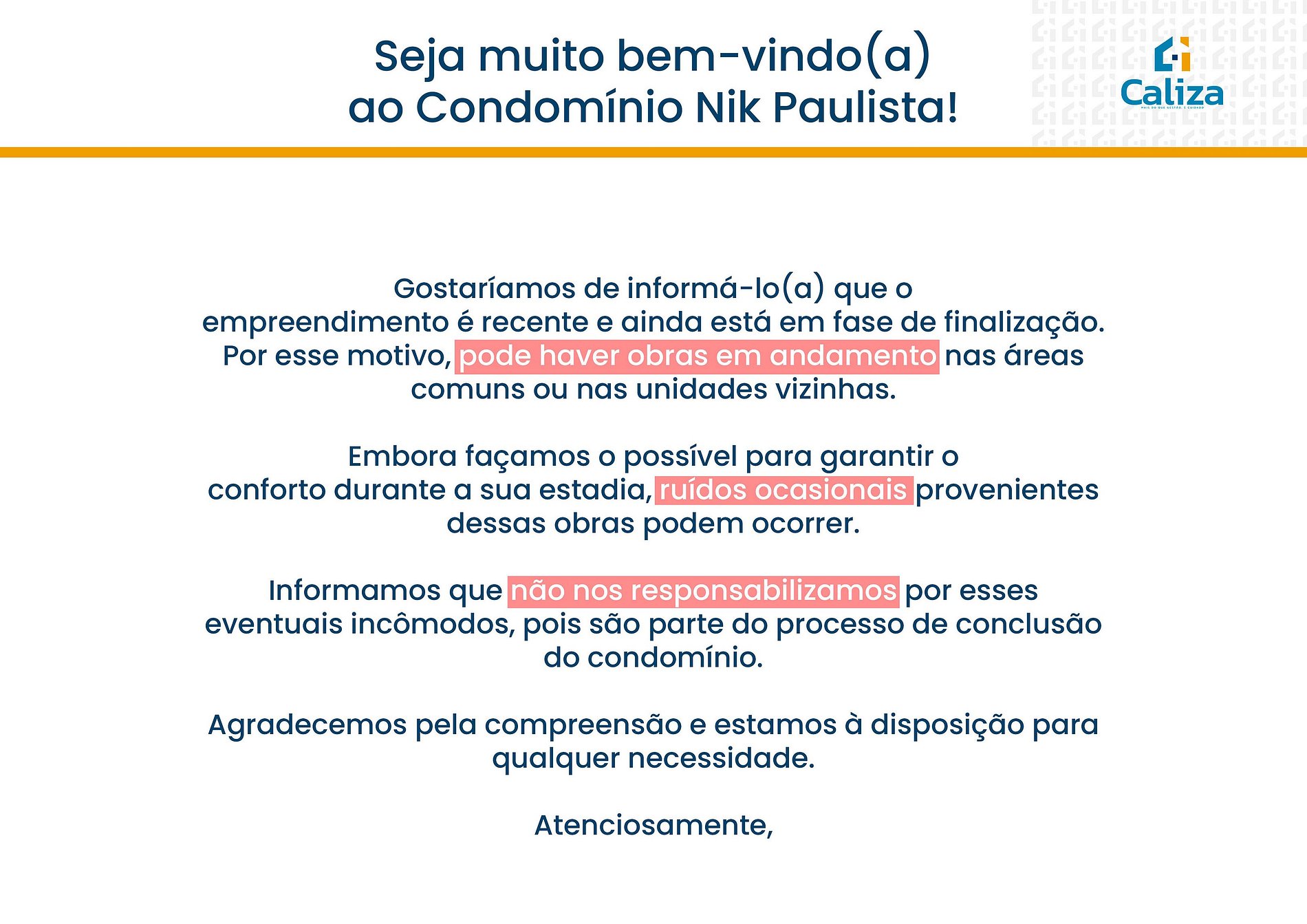 Esse condomínio é residencial e não nos responsabilizamos caso algum outro apartamento esteja em obras e cause barulho.