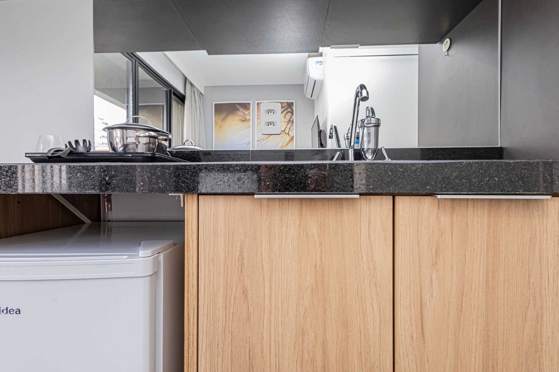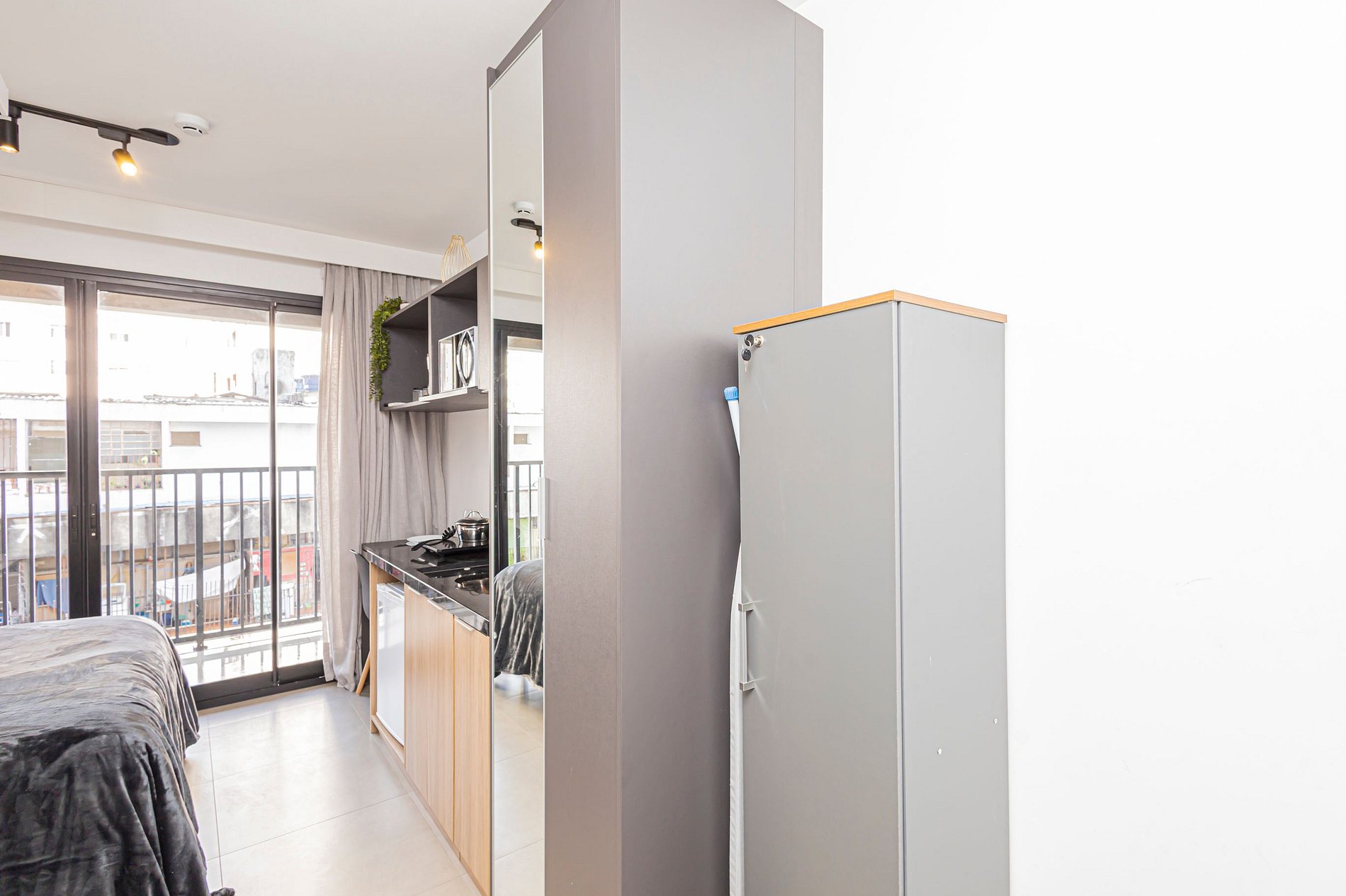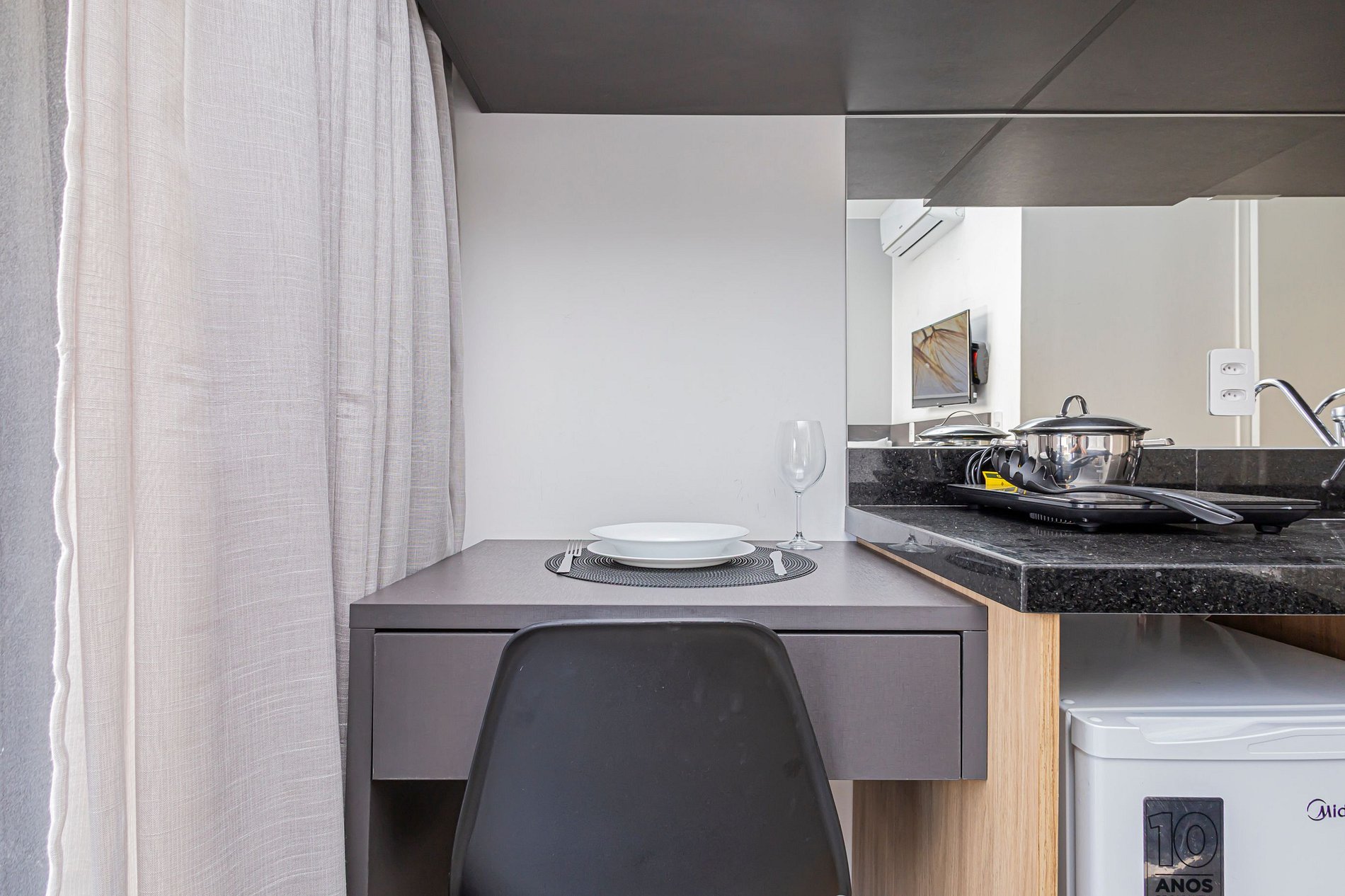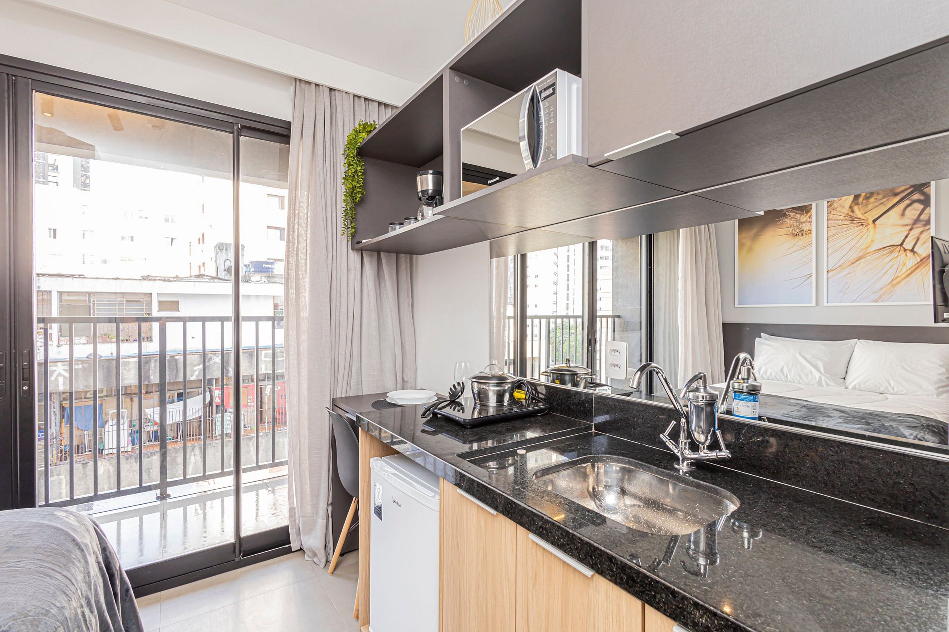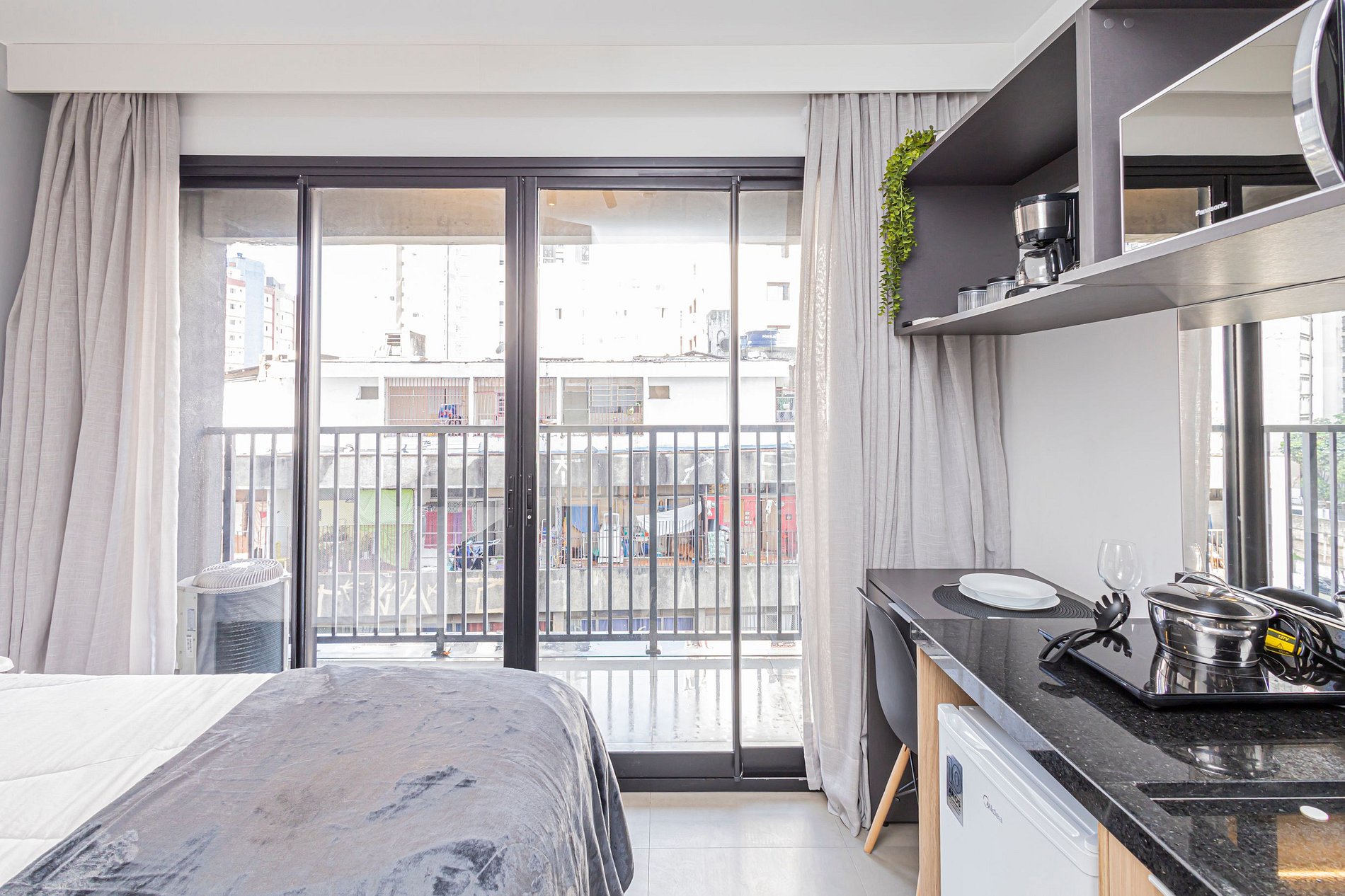 O espaço é um studio moderno e funcional, com ambiente climatizado, Wi-Fi rápido, cozinha compacta equipada, cama confortável e uma decoração clean e aconchegante. É perfeito para viajantes solo, casais, estudantes, profissionais em home office ou qualquer pessoa que deseja ficar perto de tudo.