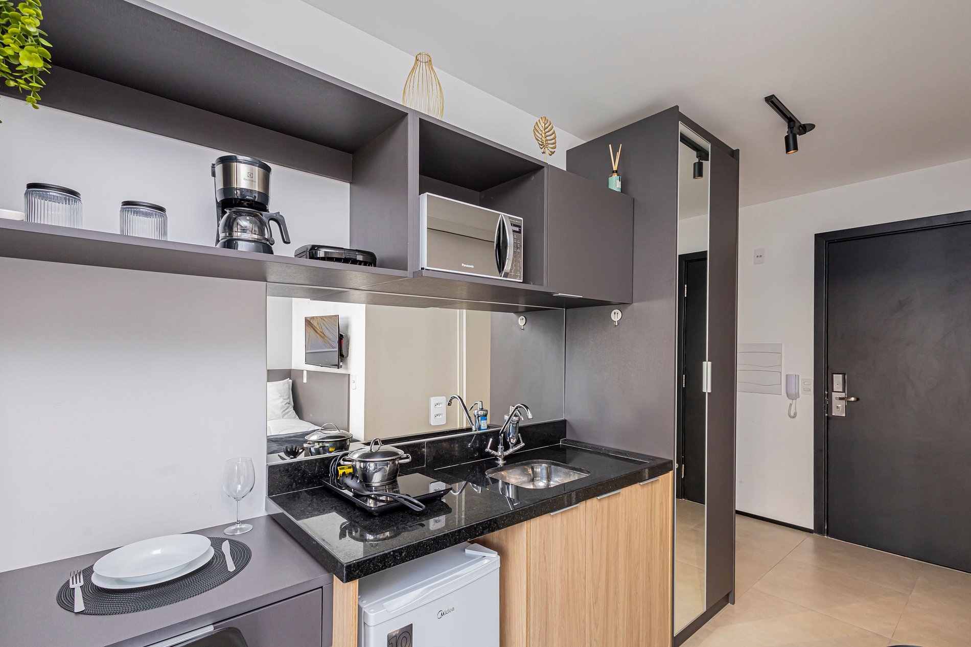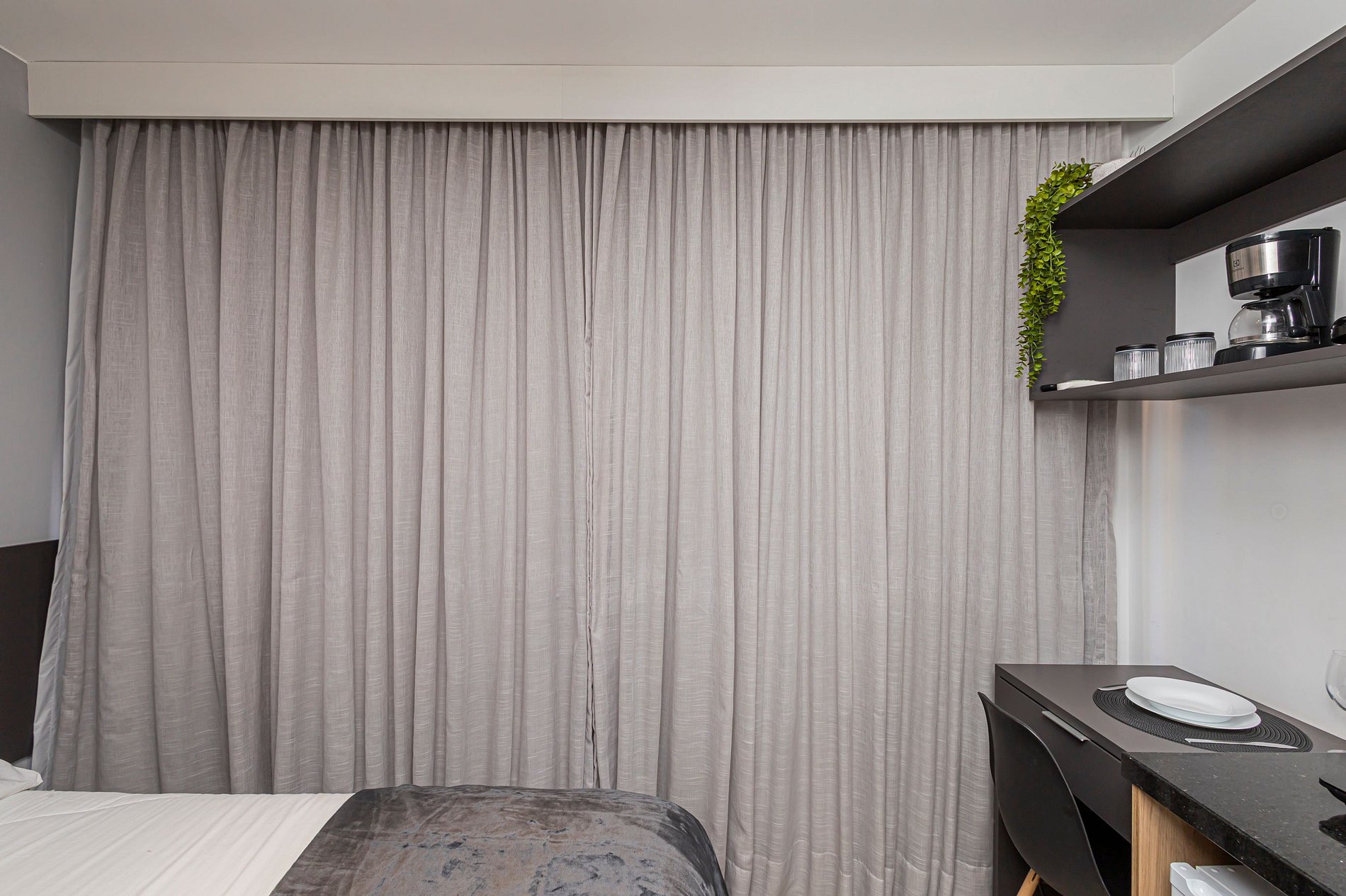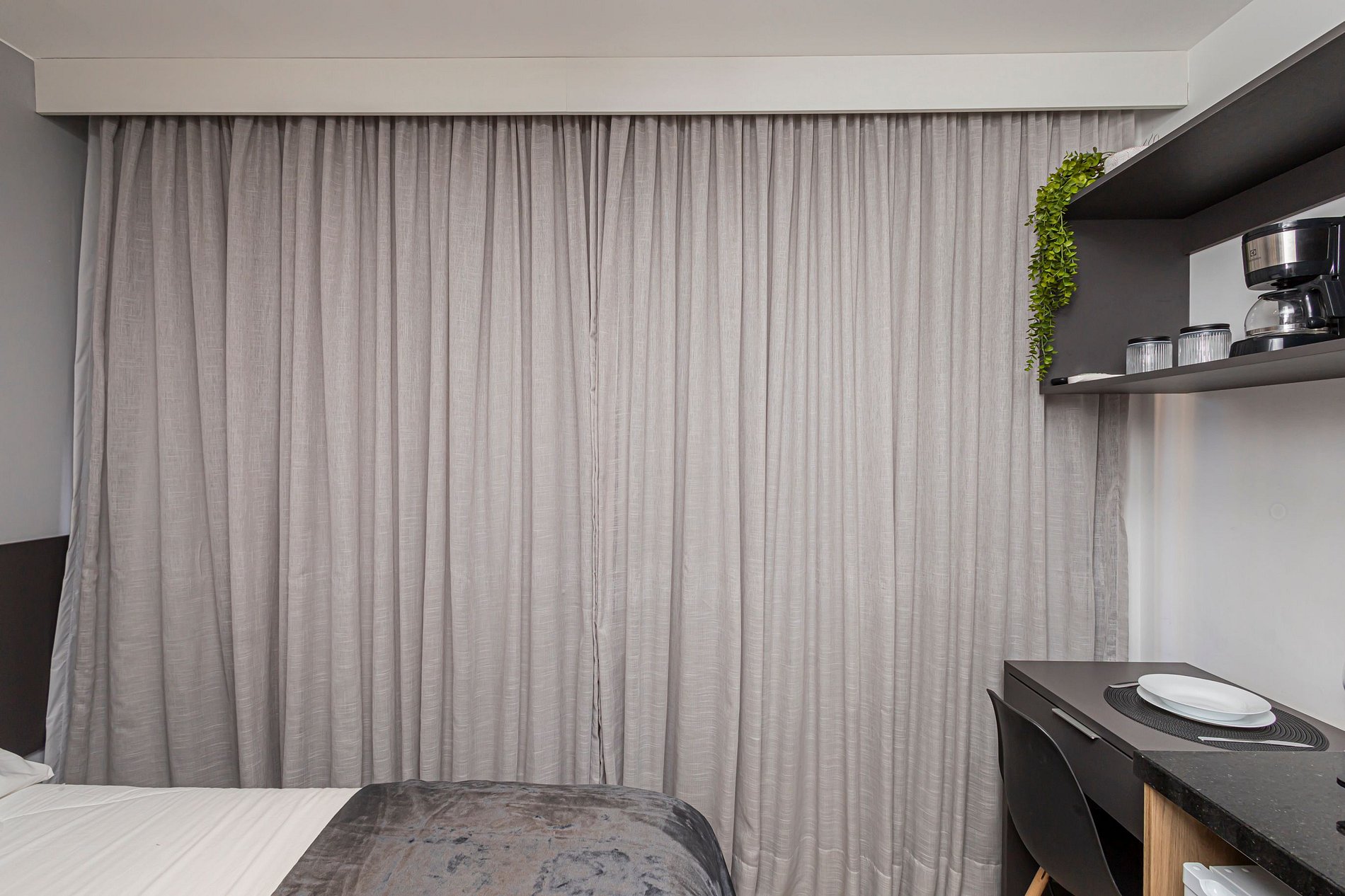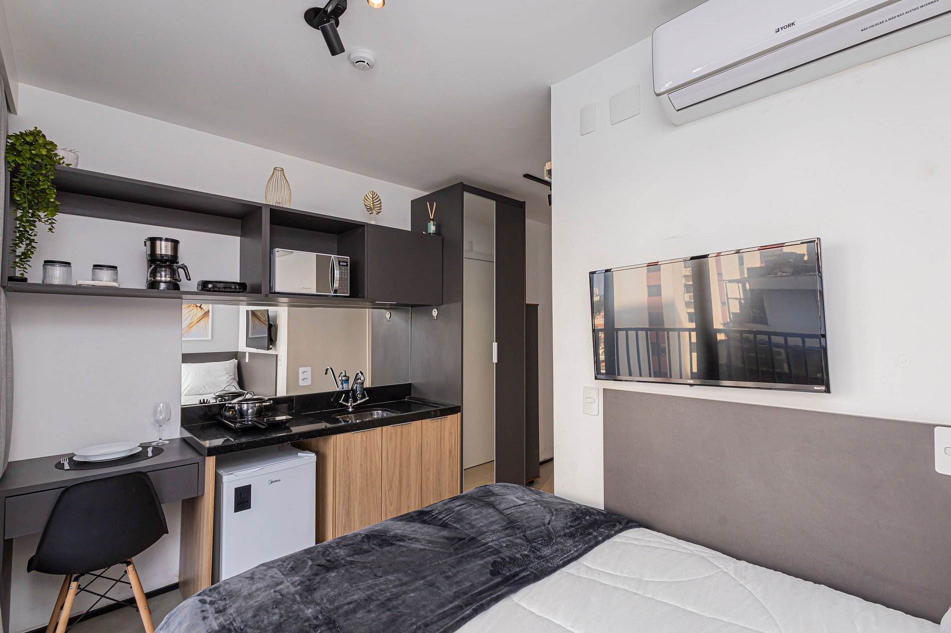 O espaço é um studio moderno e funcional, com ambiente climatizado, Wi-Fi rápido, cozinha compacta equipada, cama confortável e uma decoração clean e aconchegante. É perfeito para viajantes solo, casais, estudantes, profissionais em home office ou qualquer pessoa que deseja ficar perto de tudo.