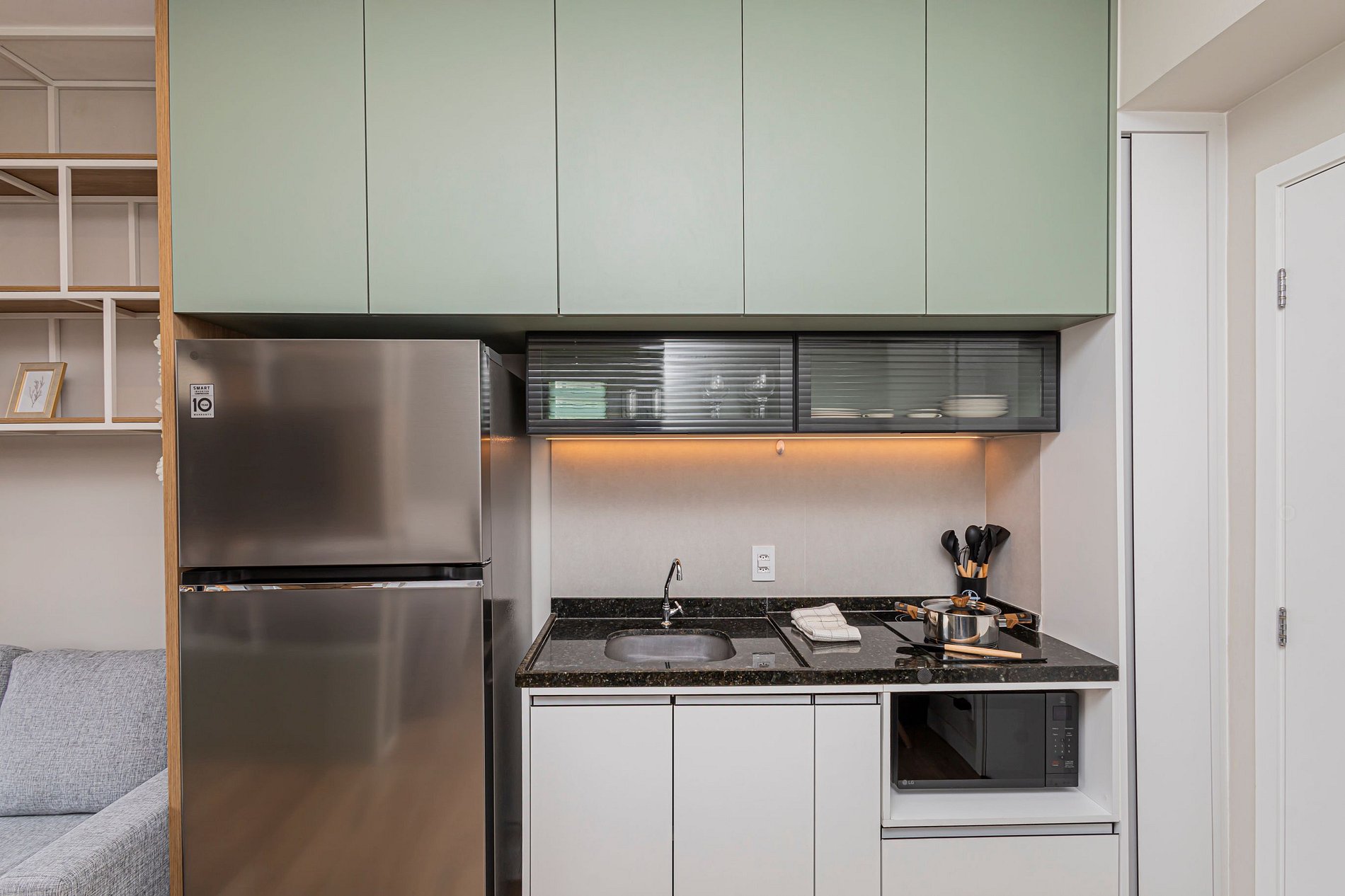 • Cozinha compacta e eficiente: Equipada com micro-ondas, fogão, geladeira e todos os utensílios necessários para preparar refeições rápidas e práticas.