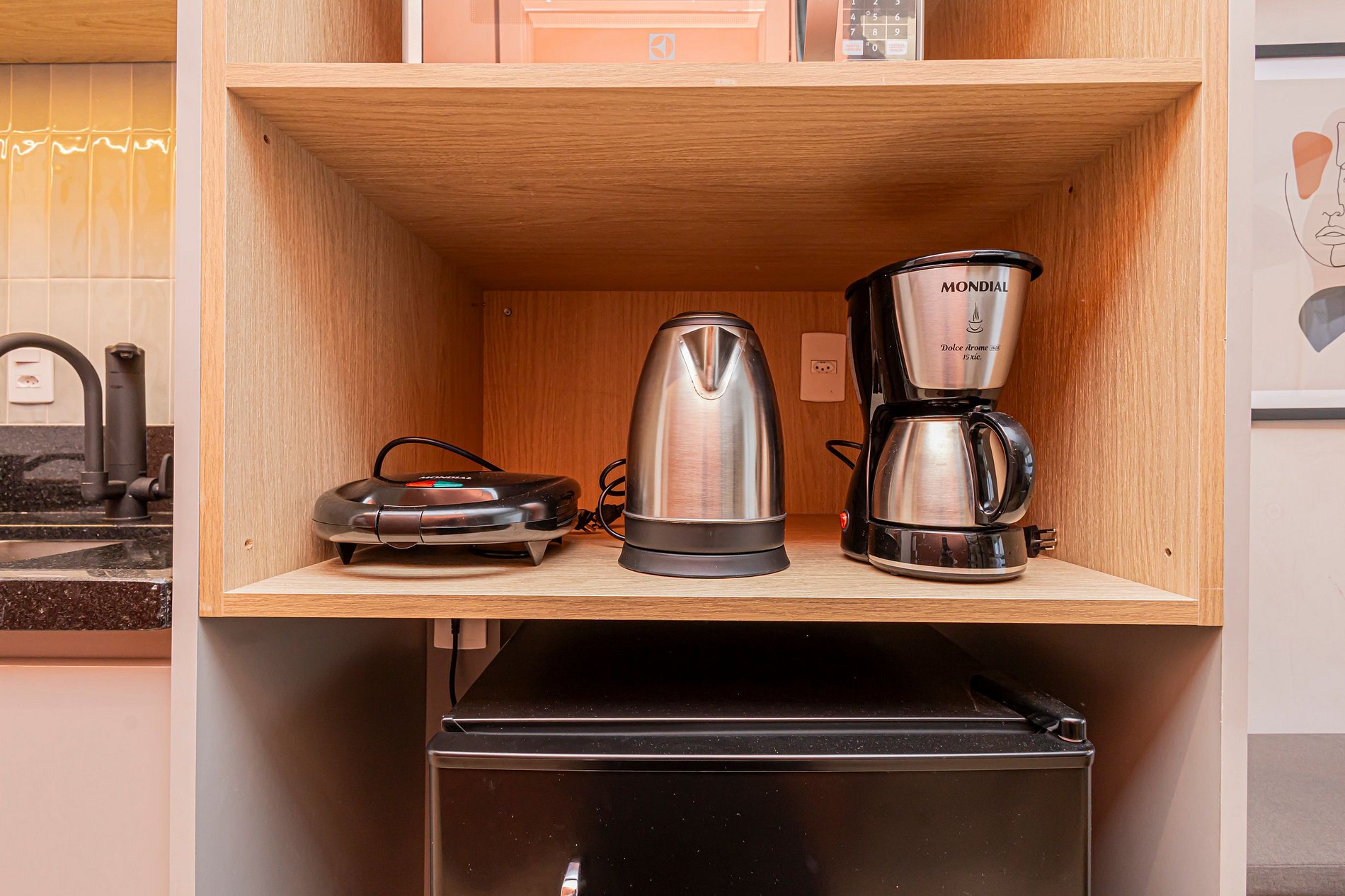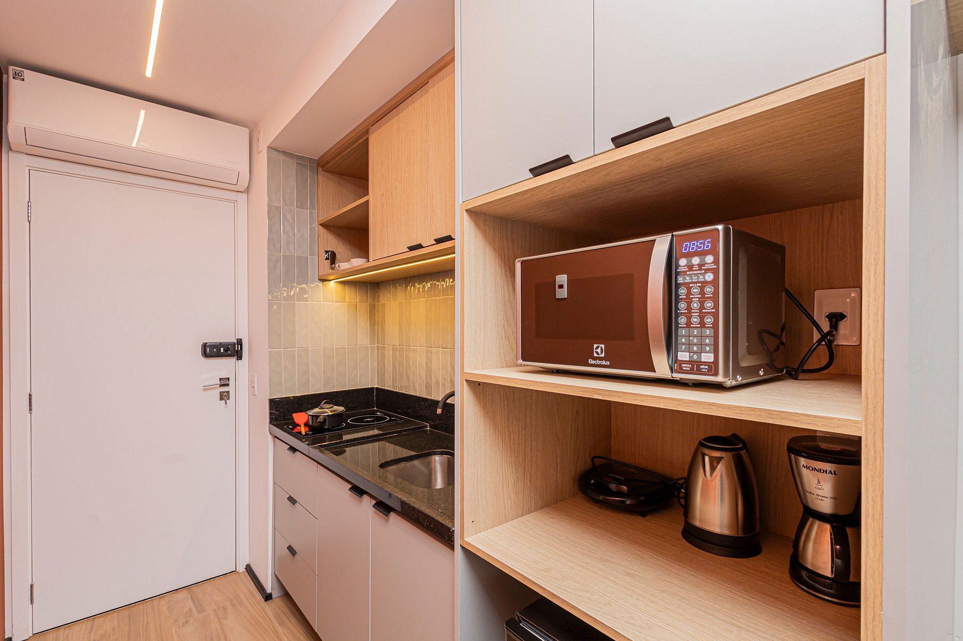 -Cozinha equipada (Frigobar, cooktop, micro-ondas, forno, utensílios)