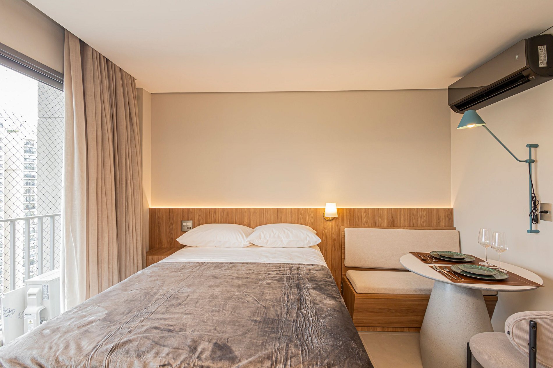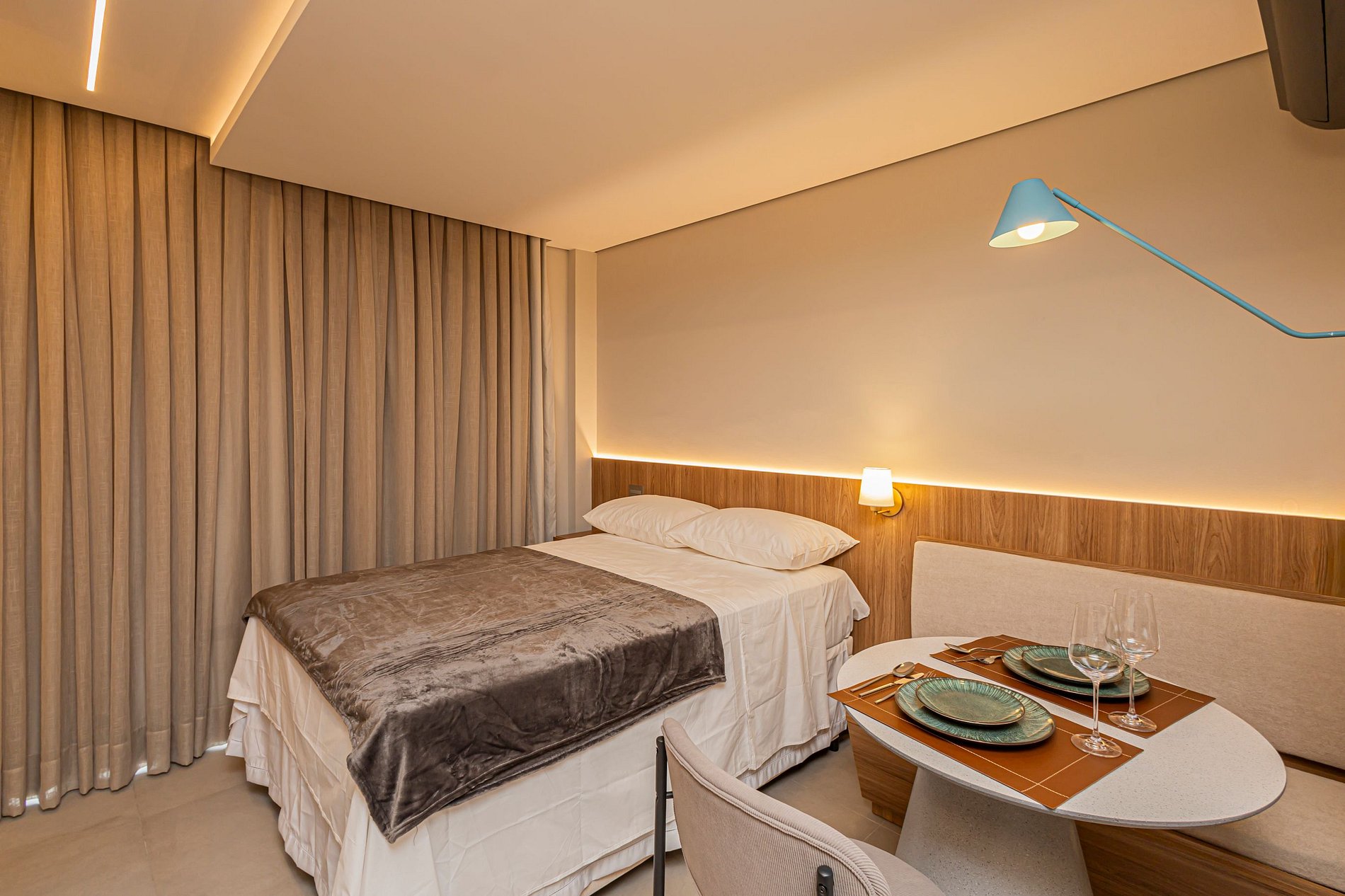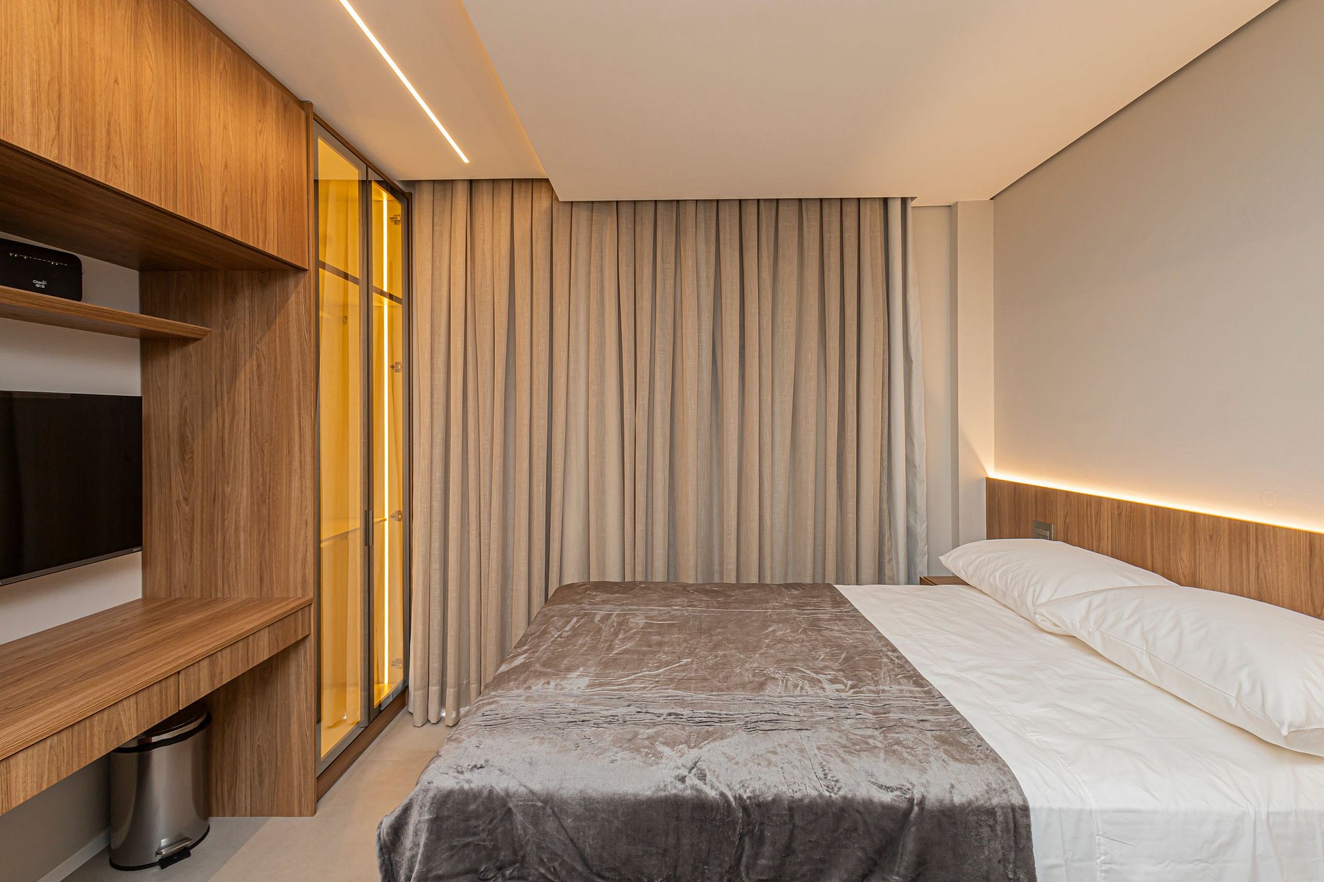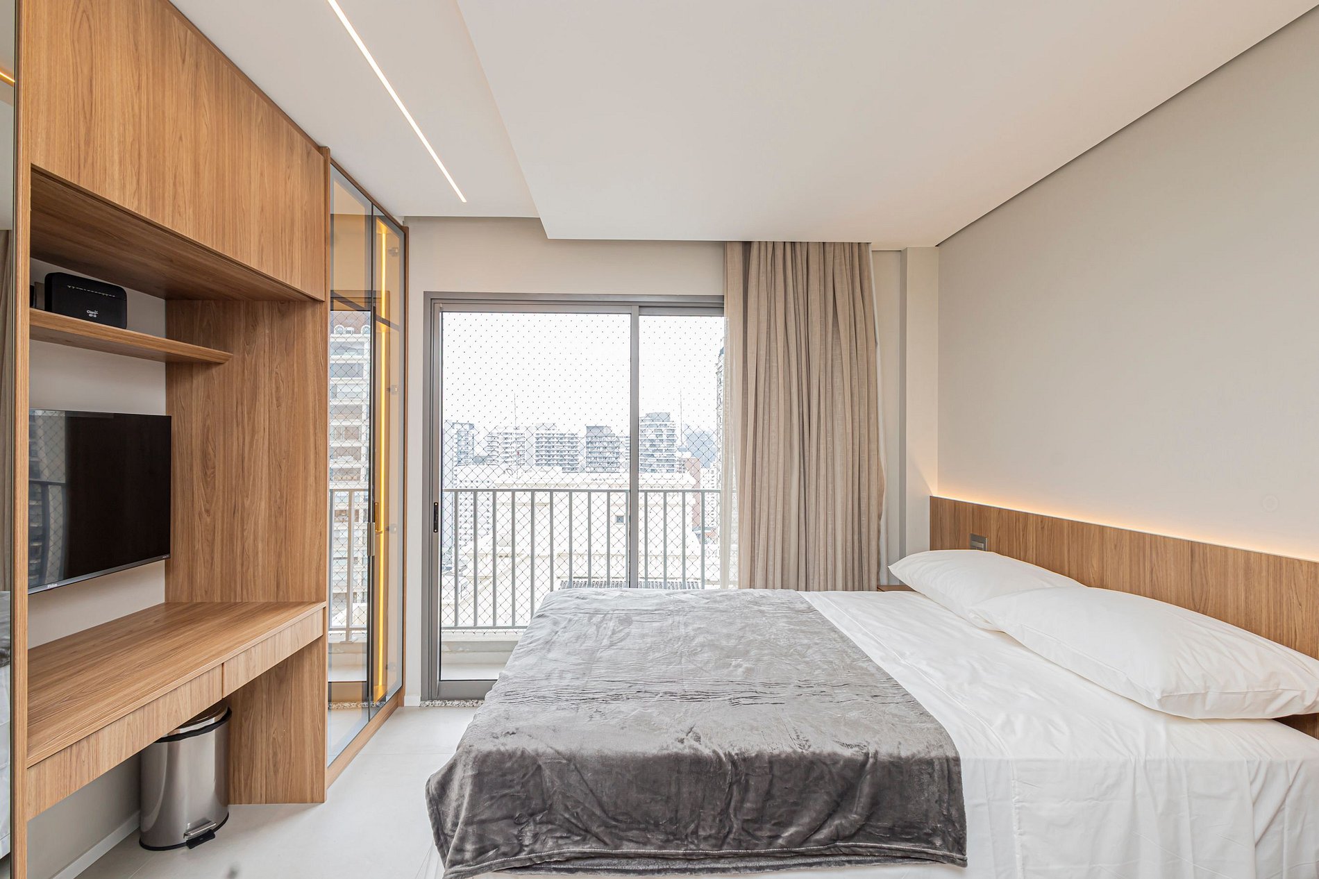 • Cama Queen com enxoval de padrão hotelaria premium, garantindo noites de descanso tranquilas.