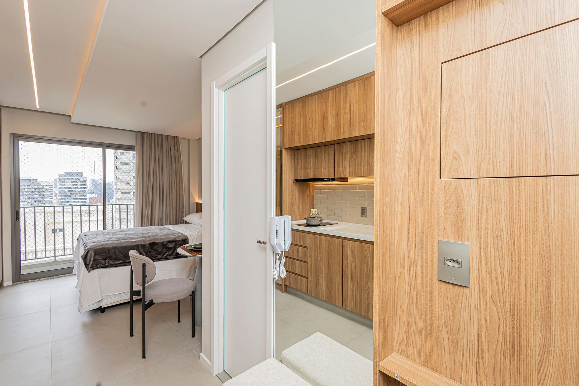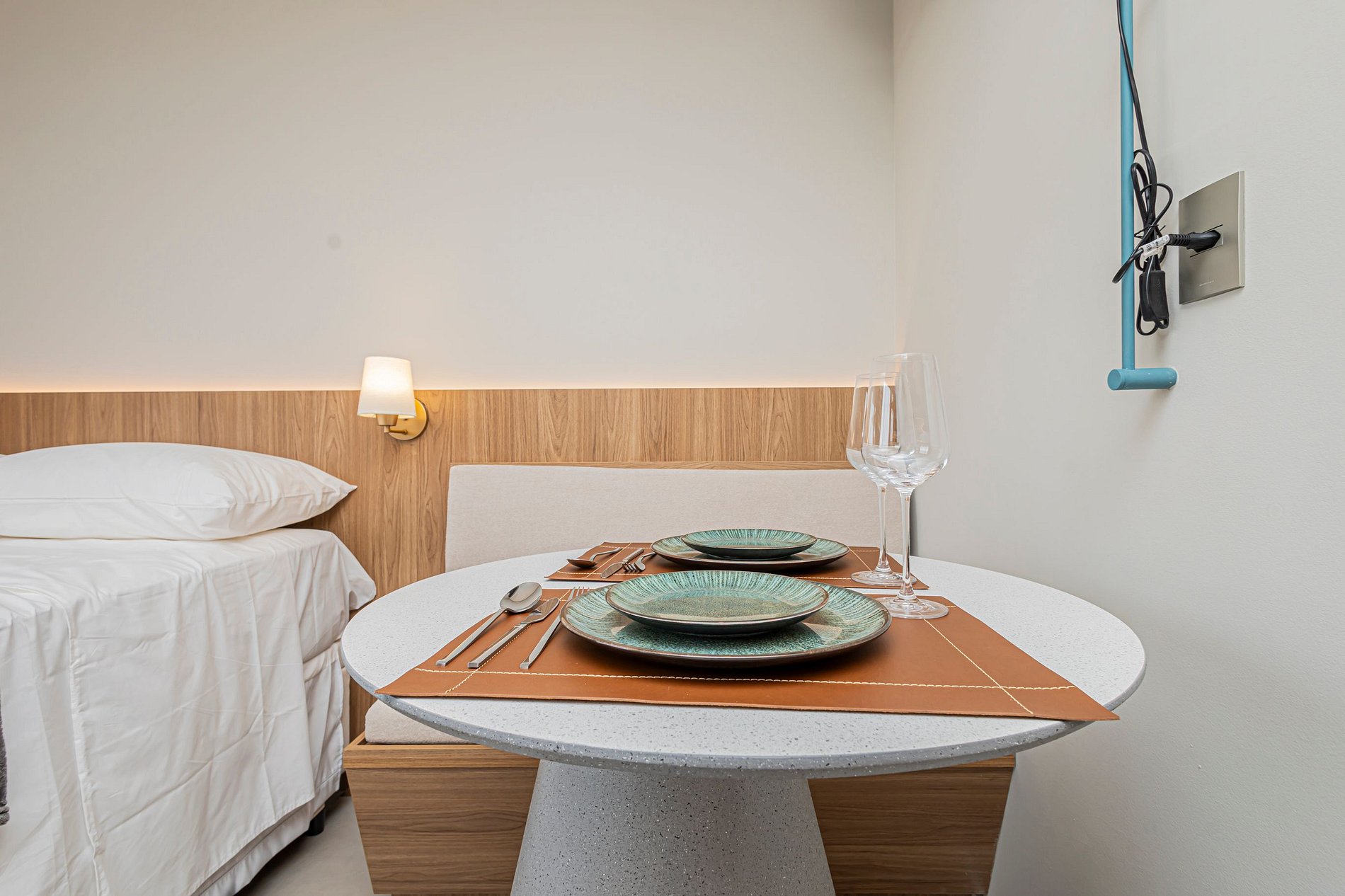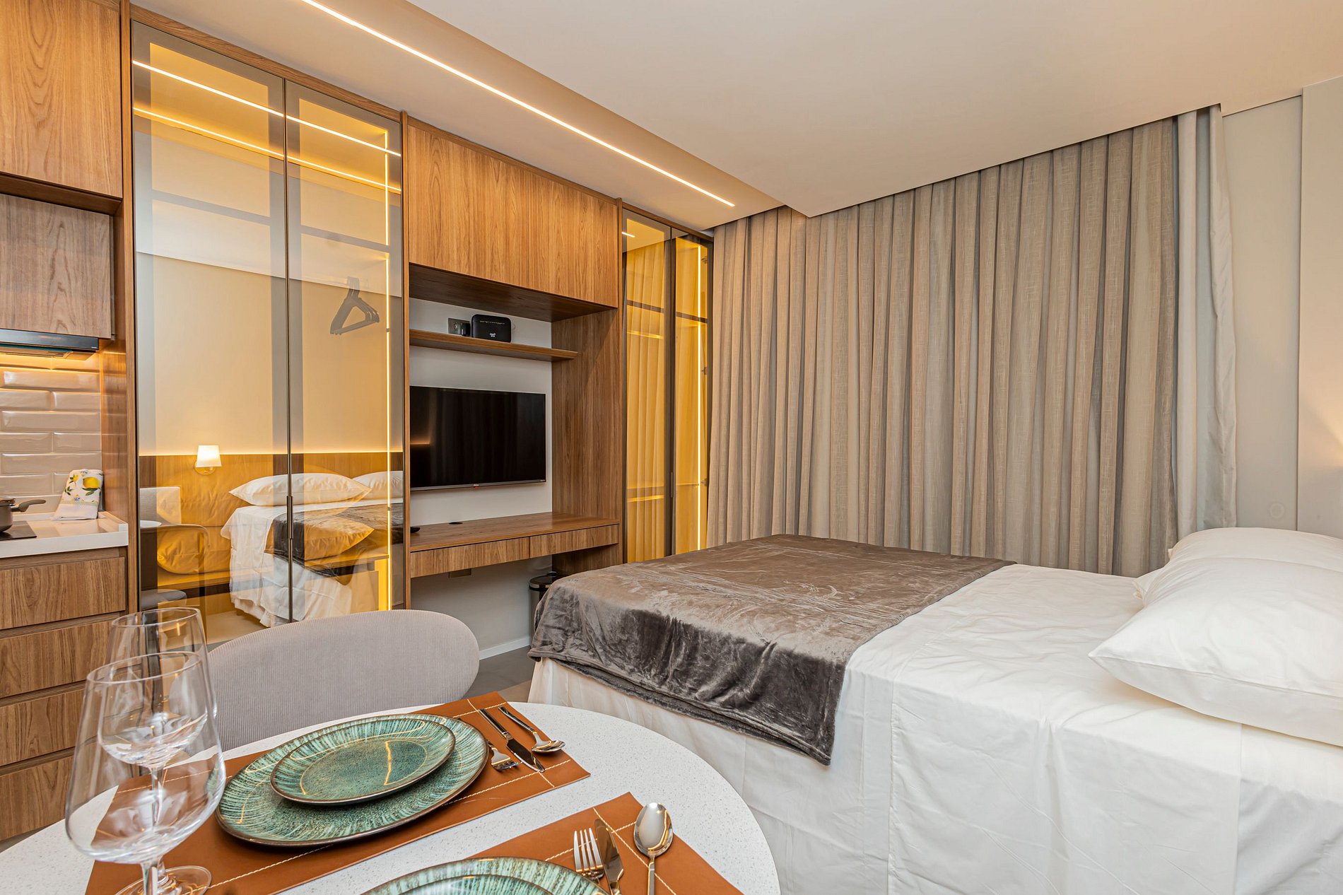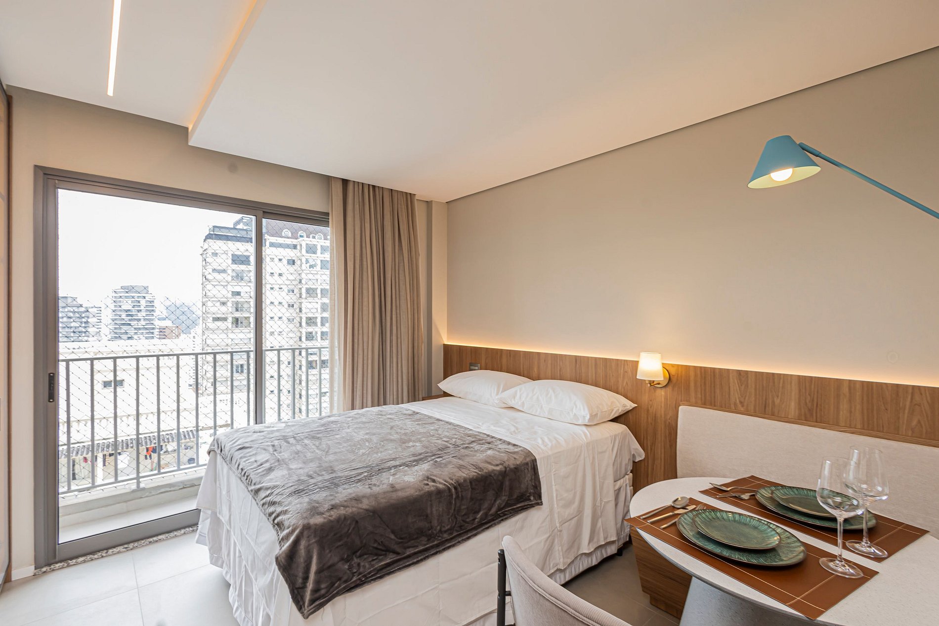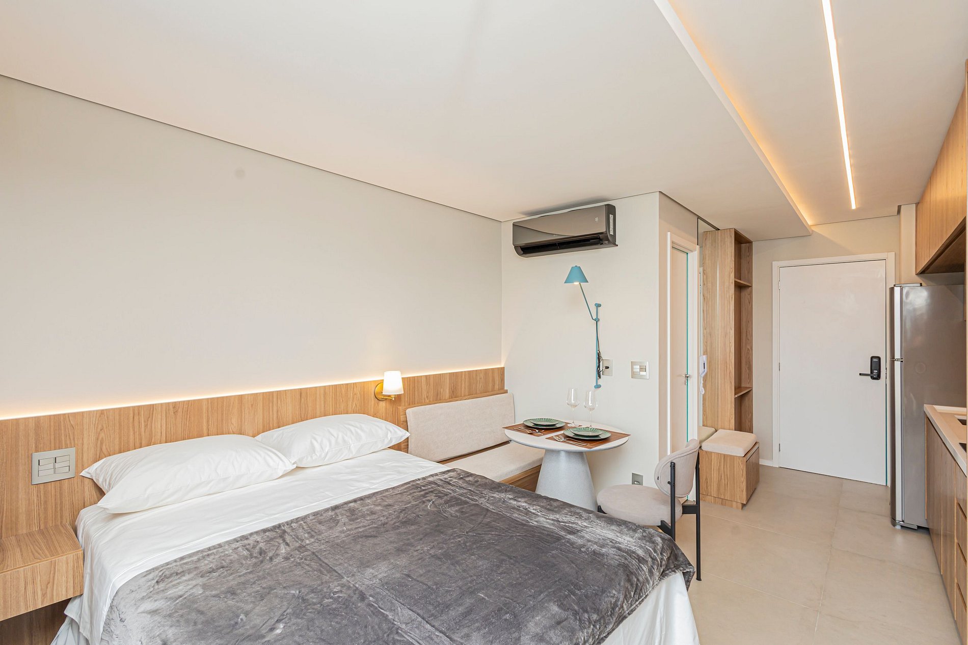 • Cama Queen com enxoval de padrão hotelaria premium, garantindo noites de descanso tranquilas.