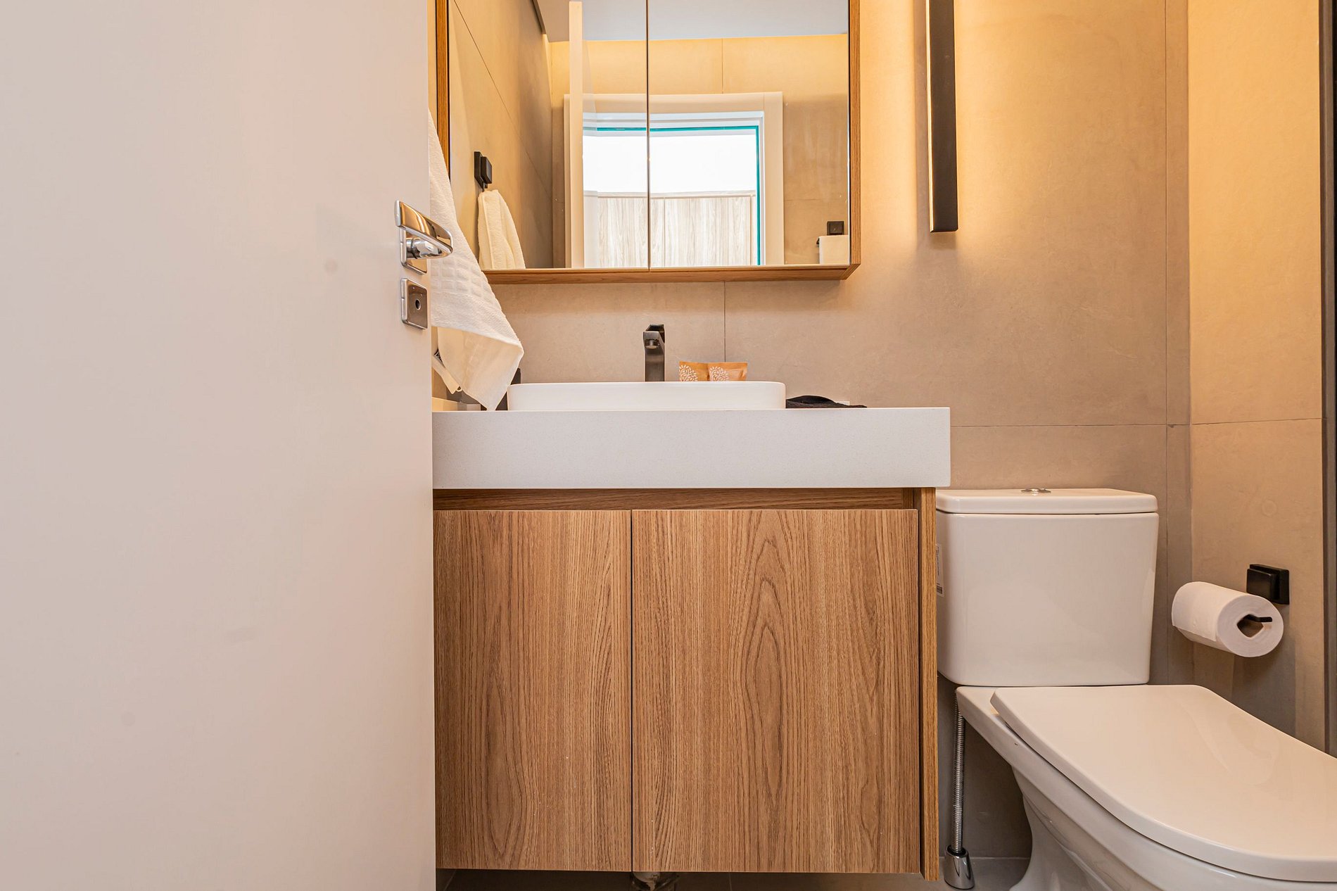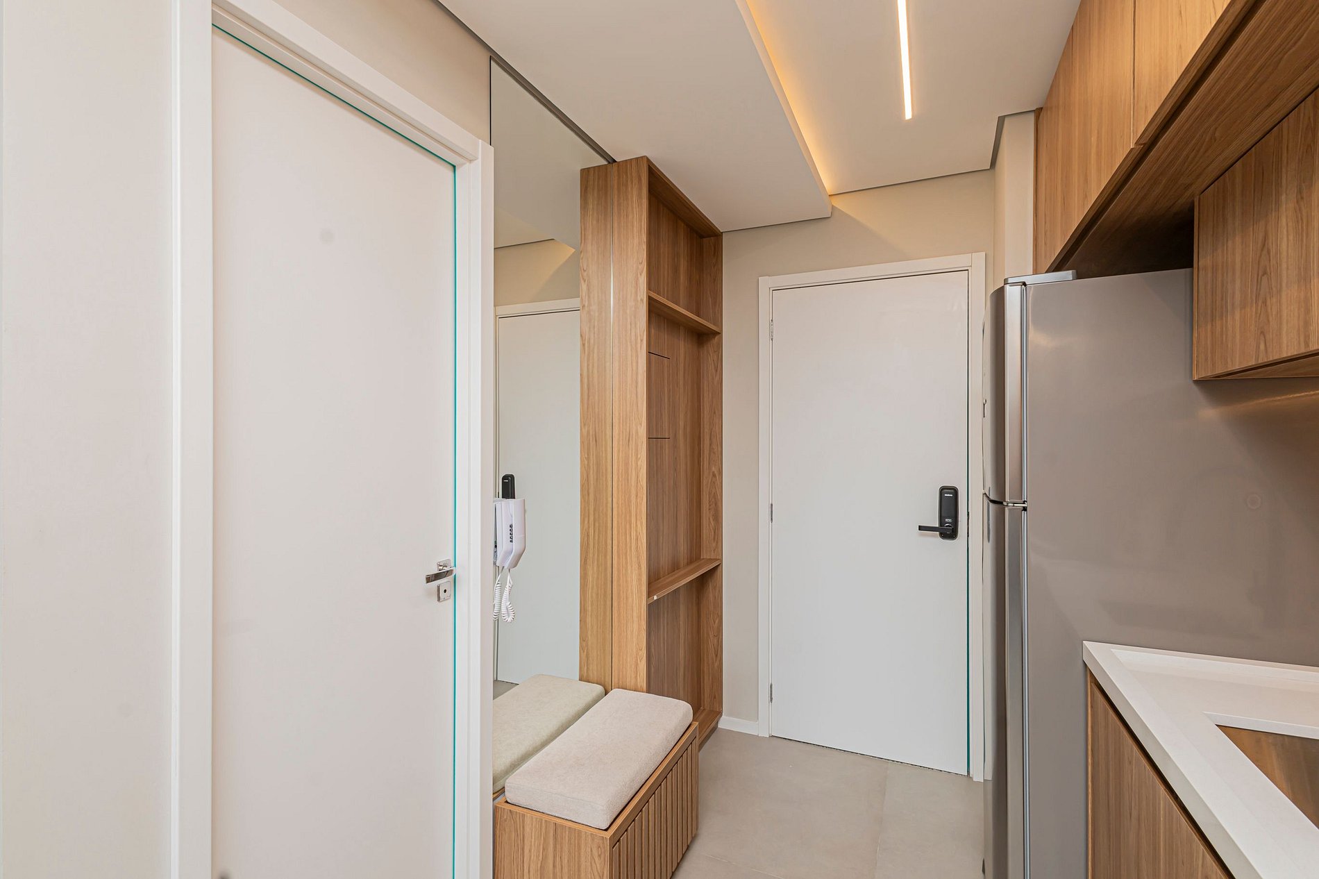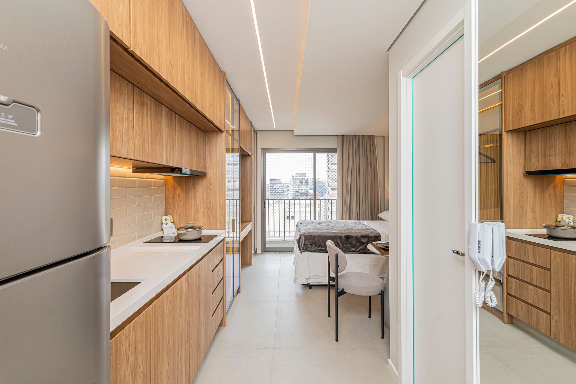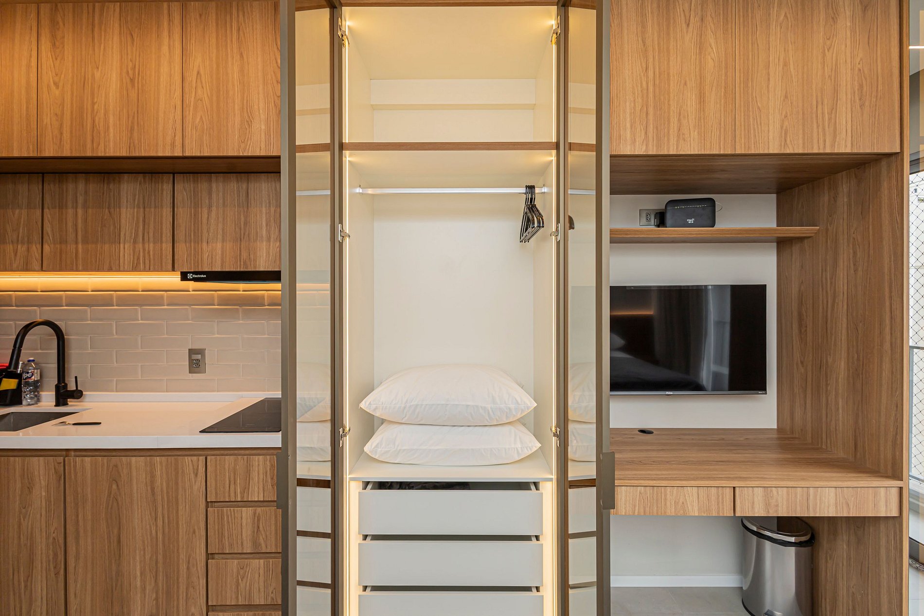 • Cama Queen com enxoval de padrão hotelaria premium, garantindo noites de descanso tranquilas.