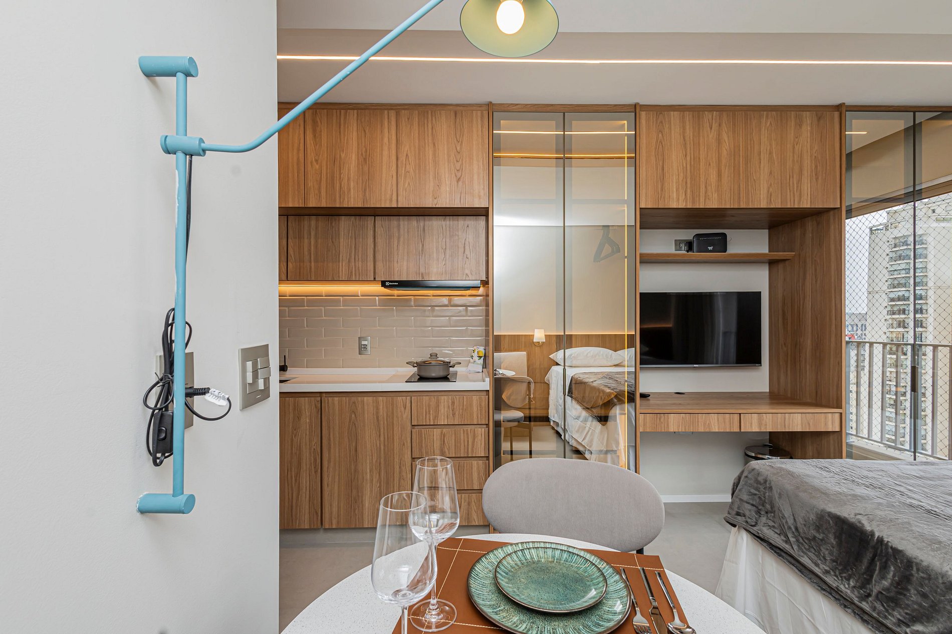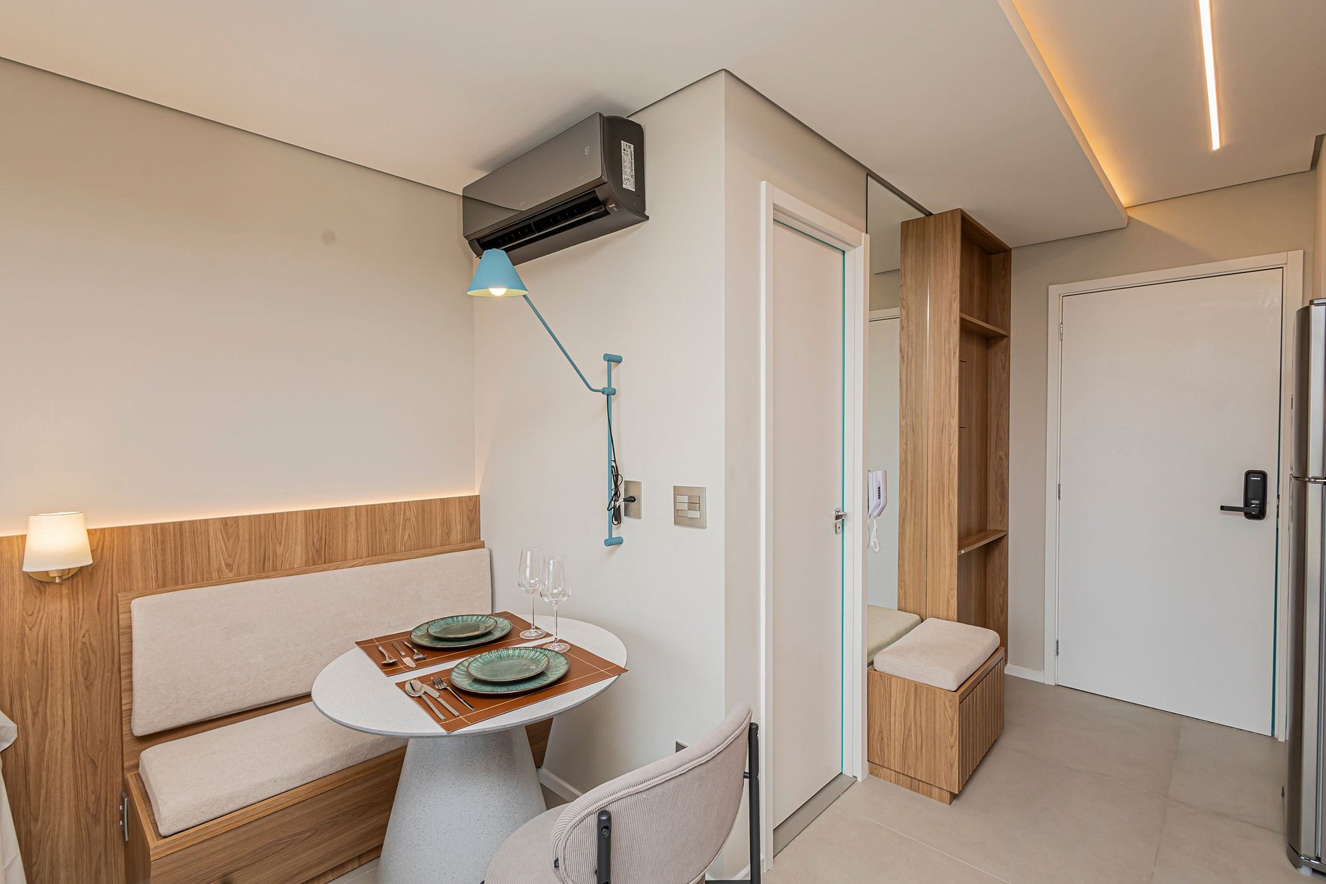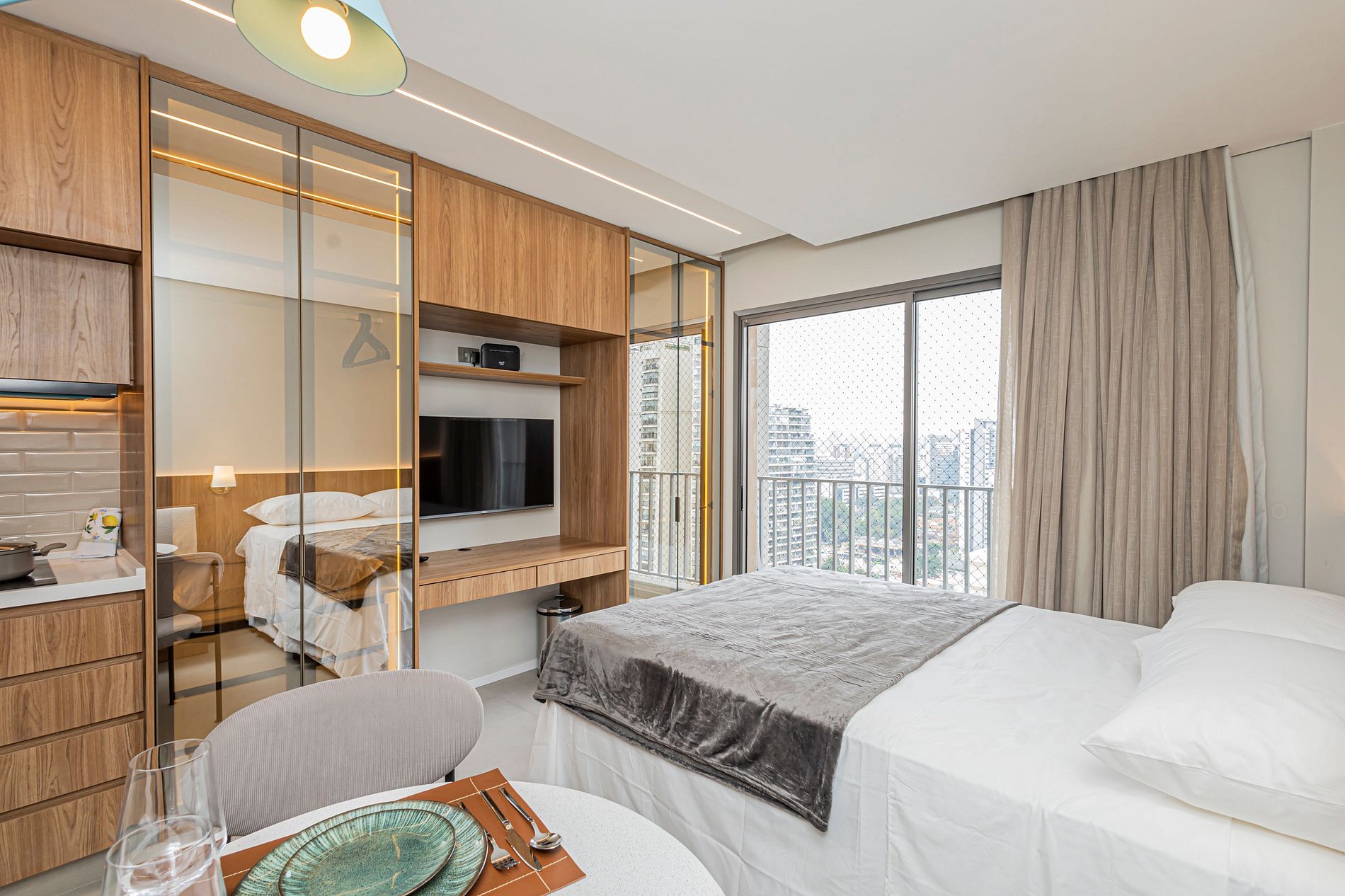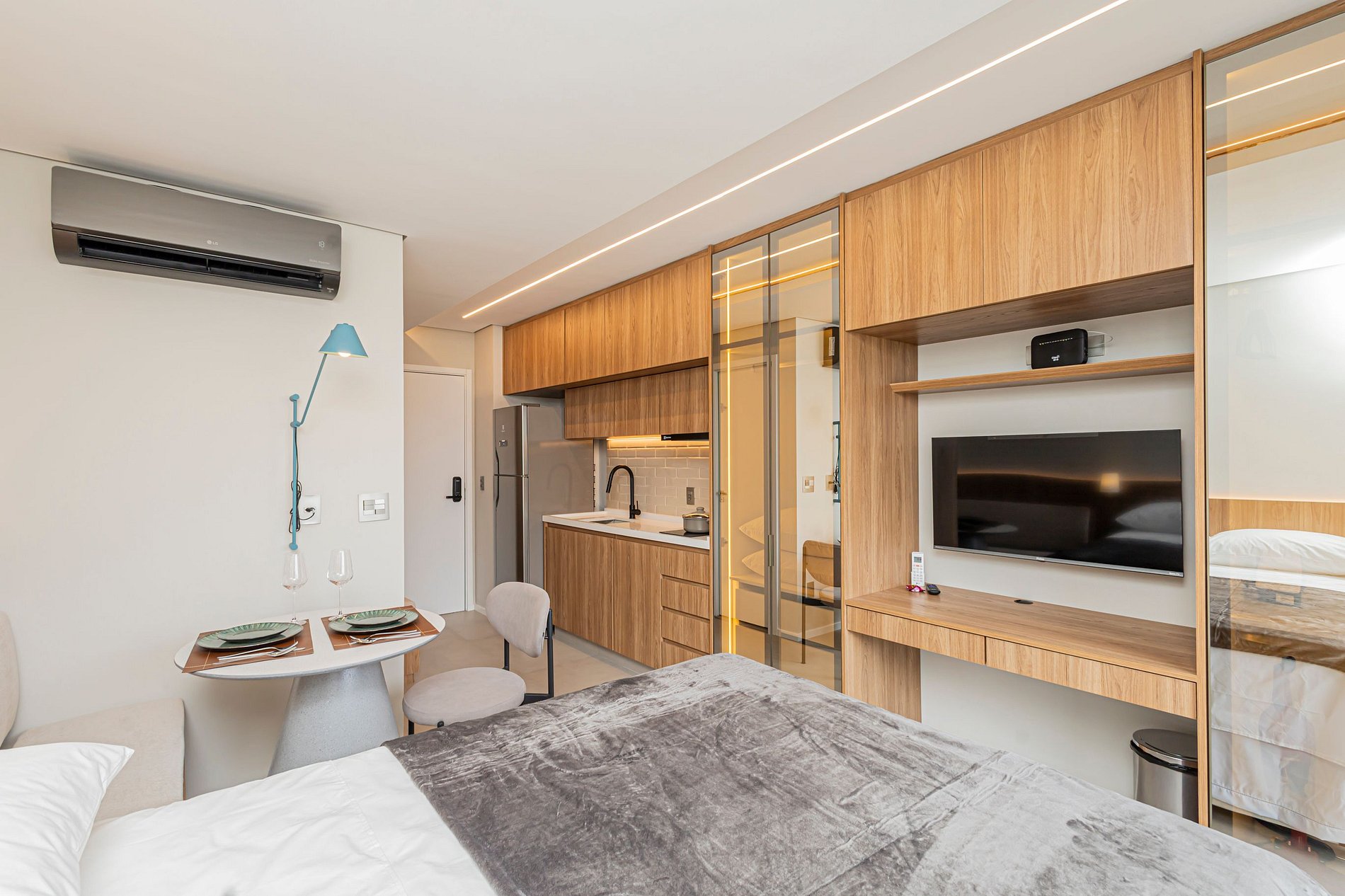 • Mesa de refeições e área de trabalho, ideal tanto para suas refeições quanto para trabalhar remotamente, com internet rápida.