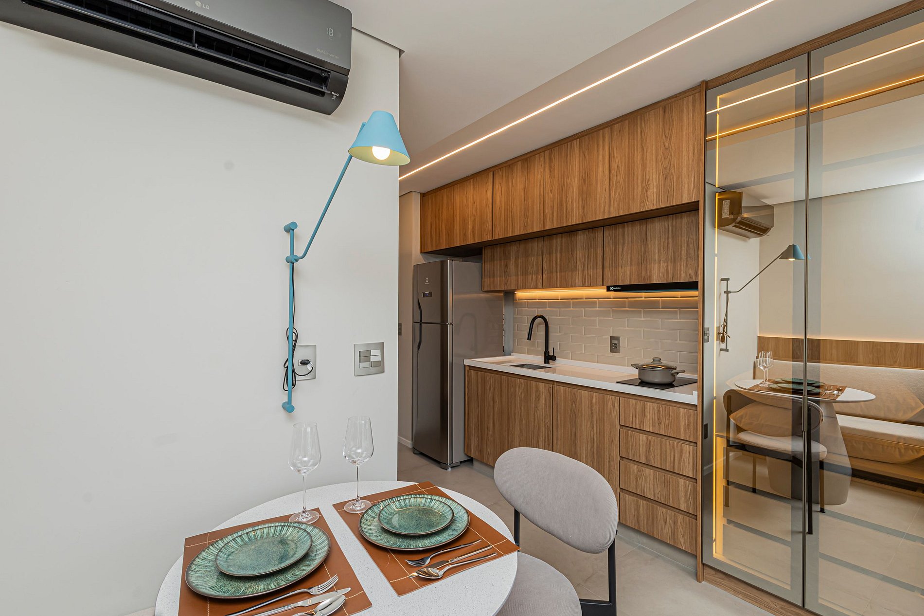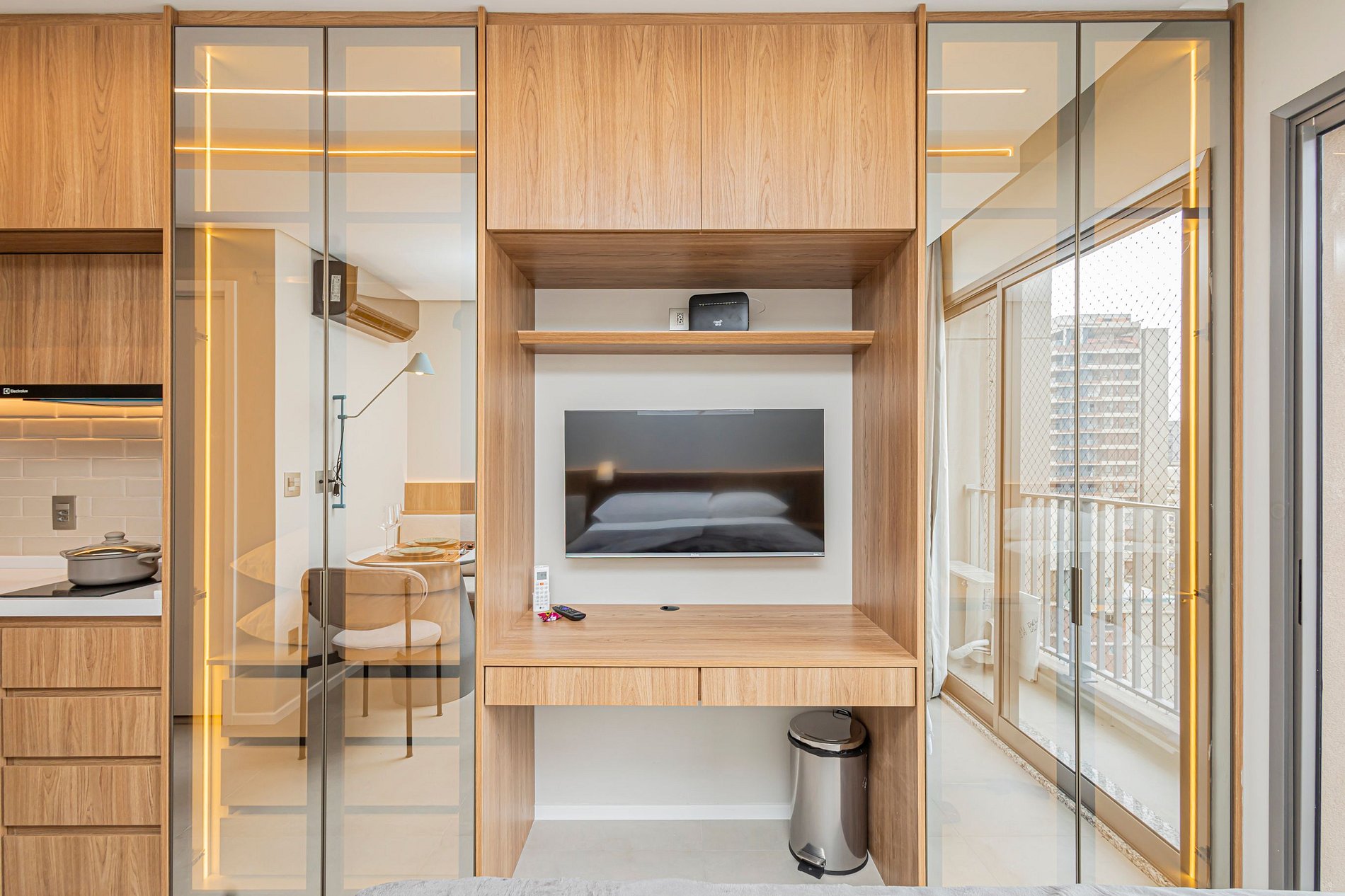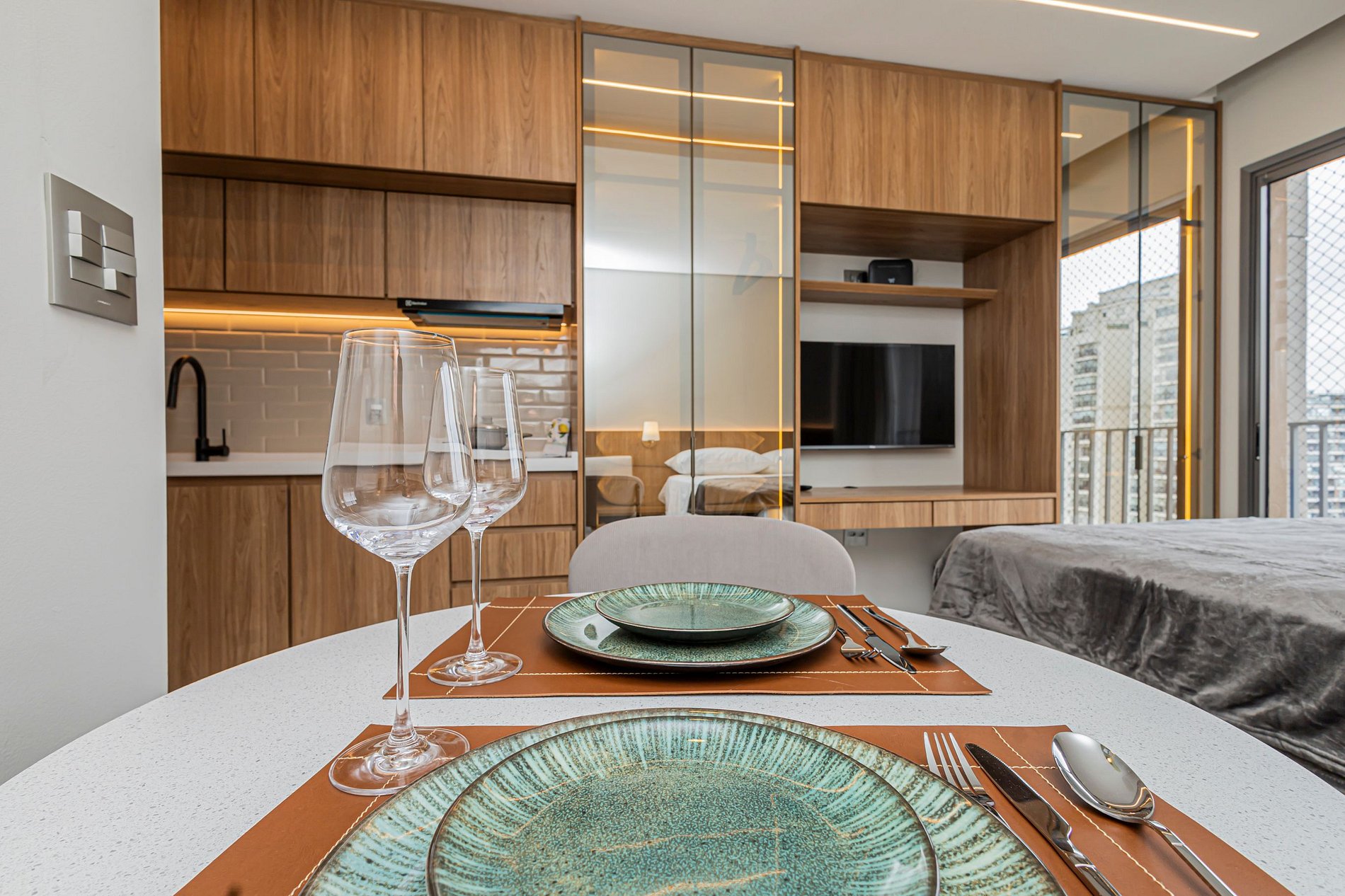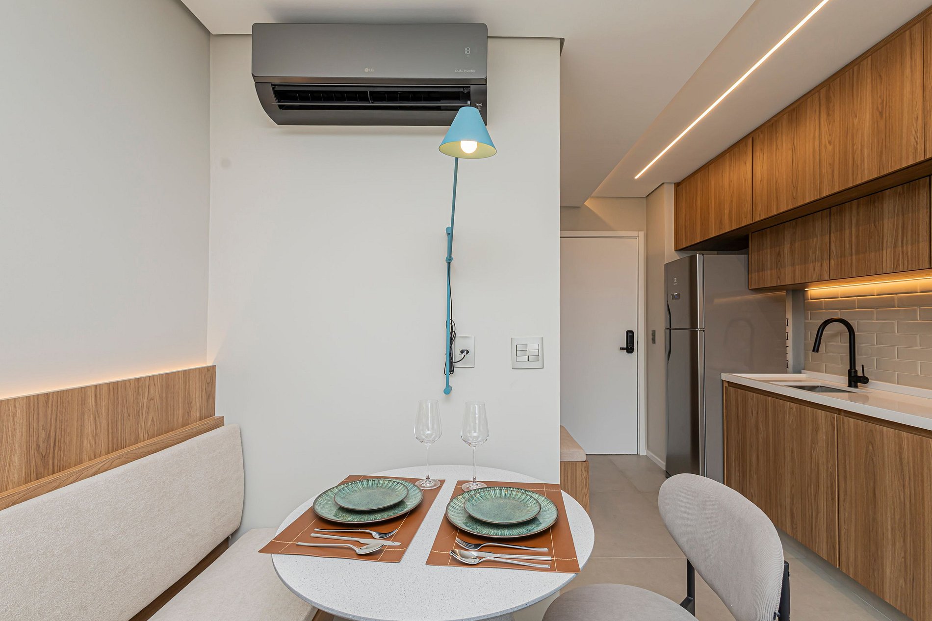 • Mesa de refeições e área de trabalho, ideal tanto para suas refeições quanto para trabalhar remotamente, com internet rápida.