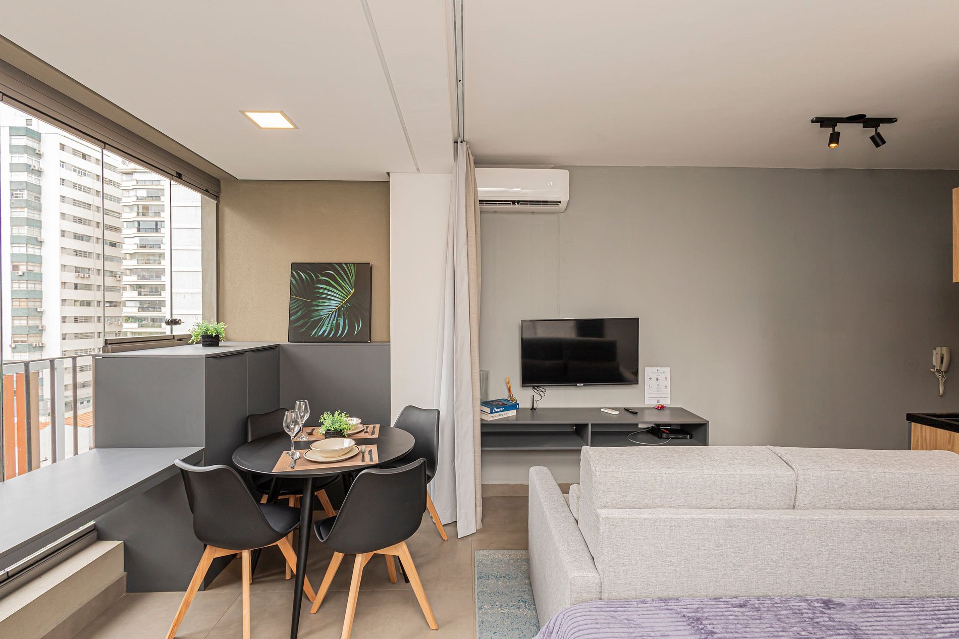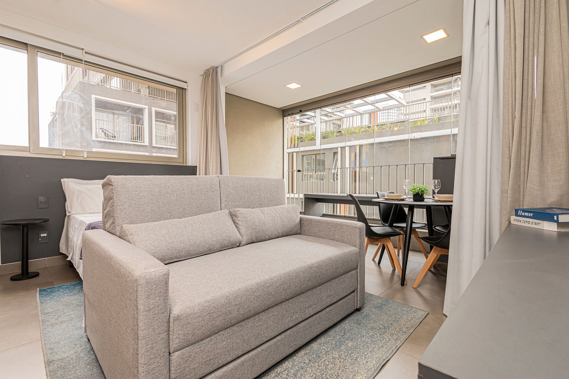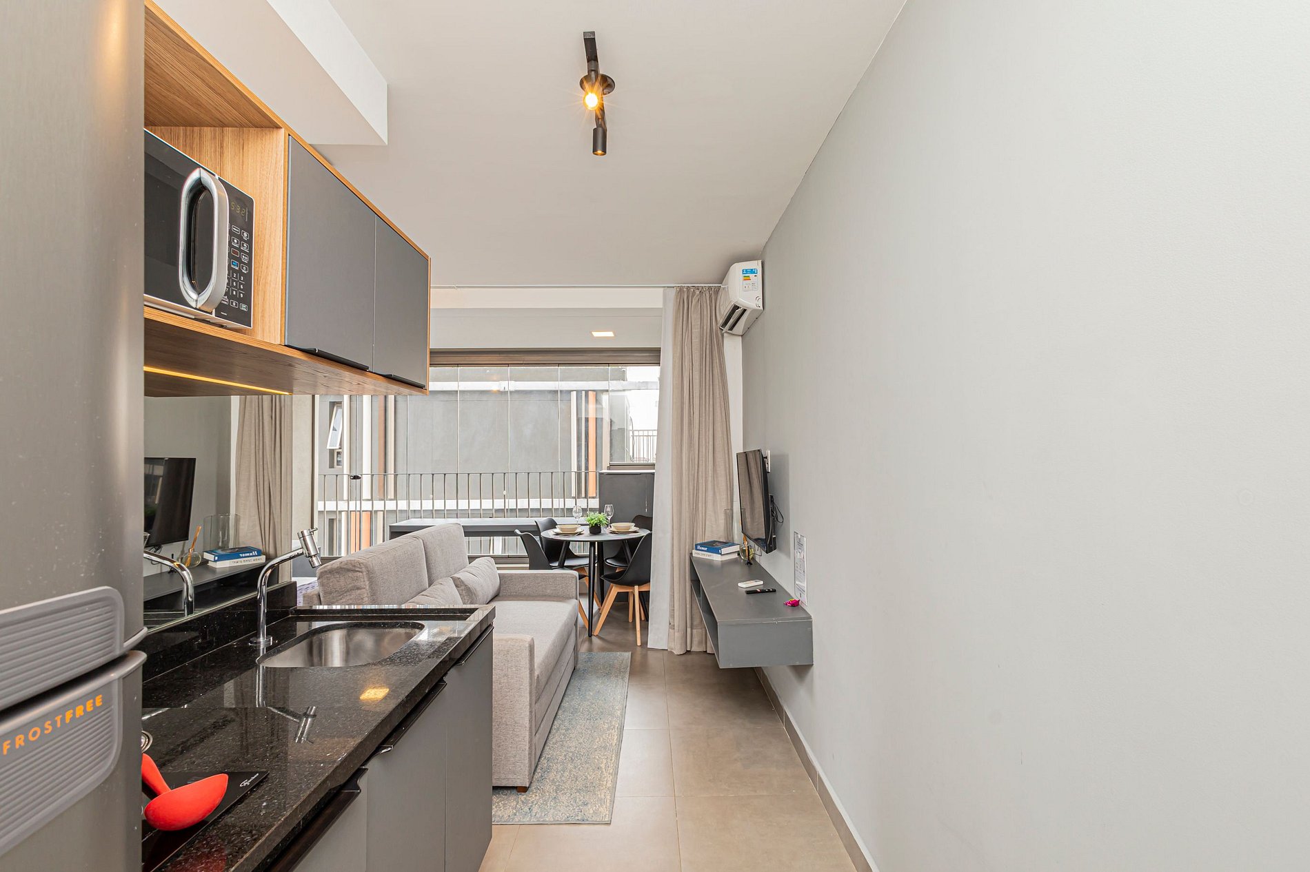 O studio oferece um ambiente iluminado, funcional e confortável, ideal tanto para estadias curtas quanto prolongadas.