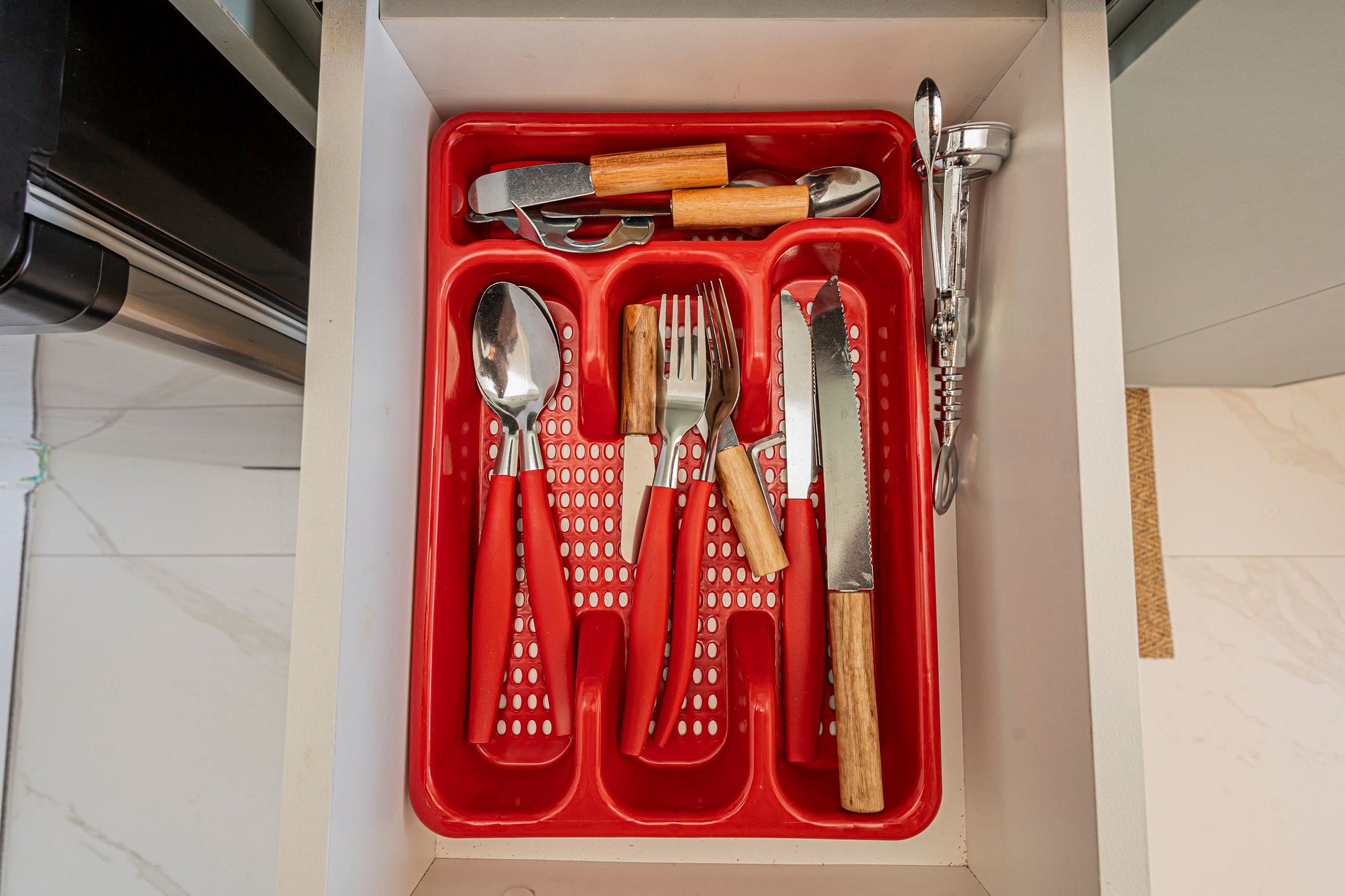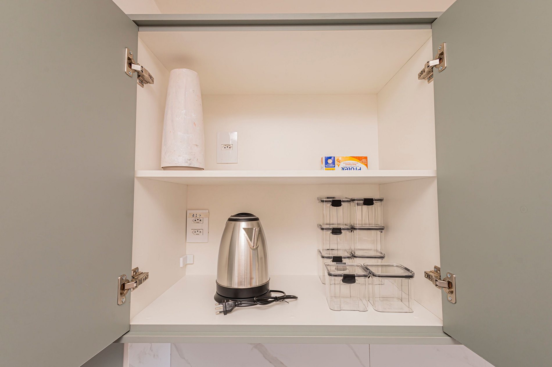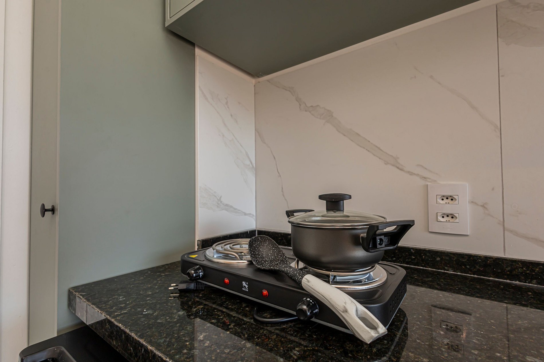 • Cozinha compacta e eficiente: Equipada com micro-ondas, fogão, geladeira e todos os utensílios necessários para preparar refeições rápidas e práticas.