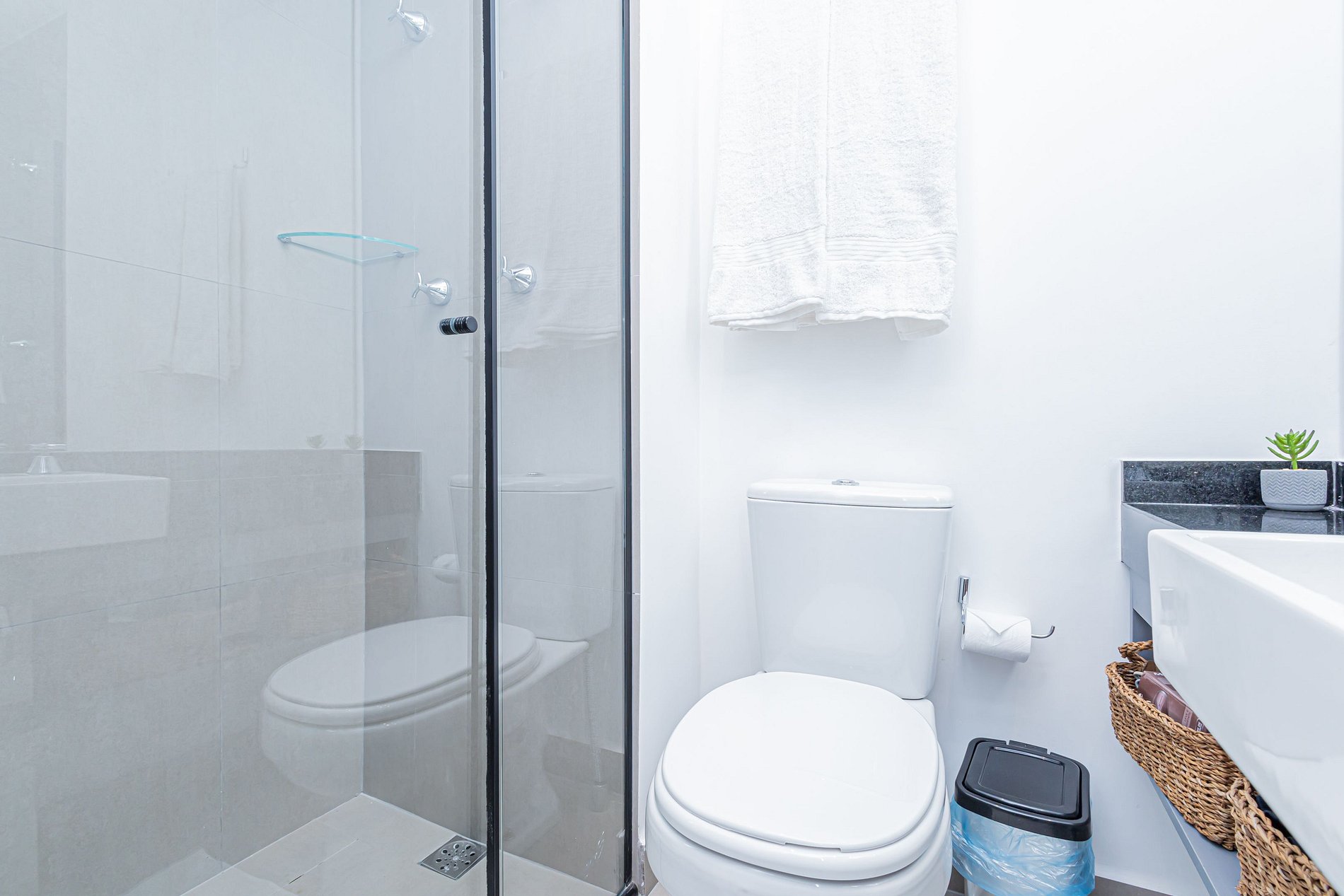 - *Banheiro moderno* com chuveiro a gás e toalhas super macias