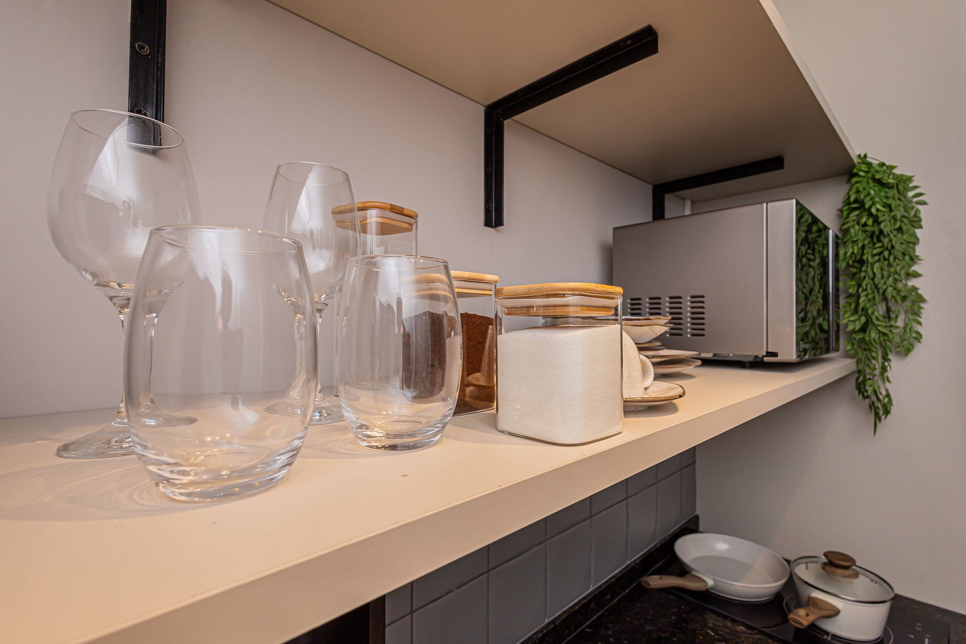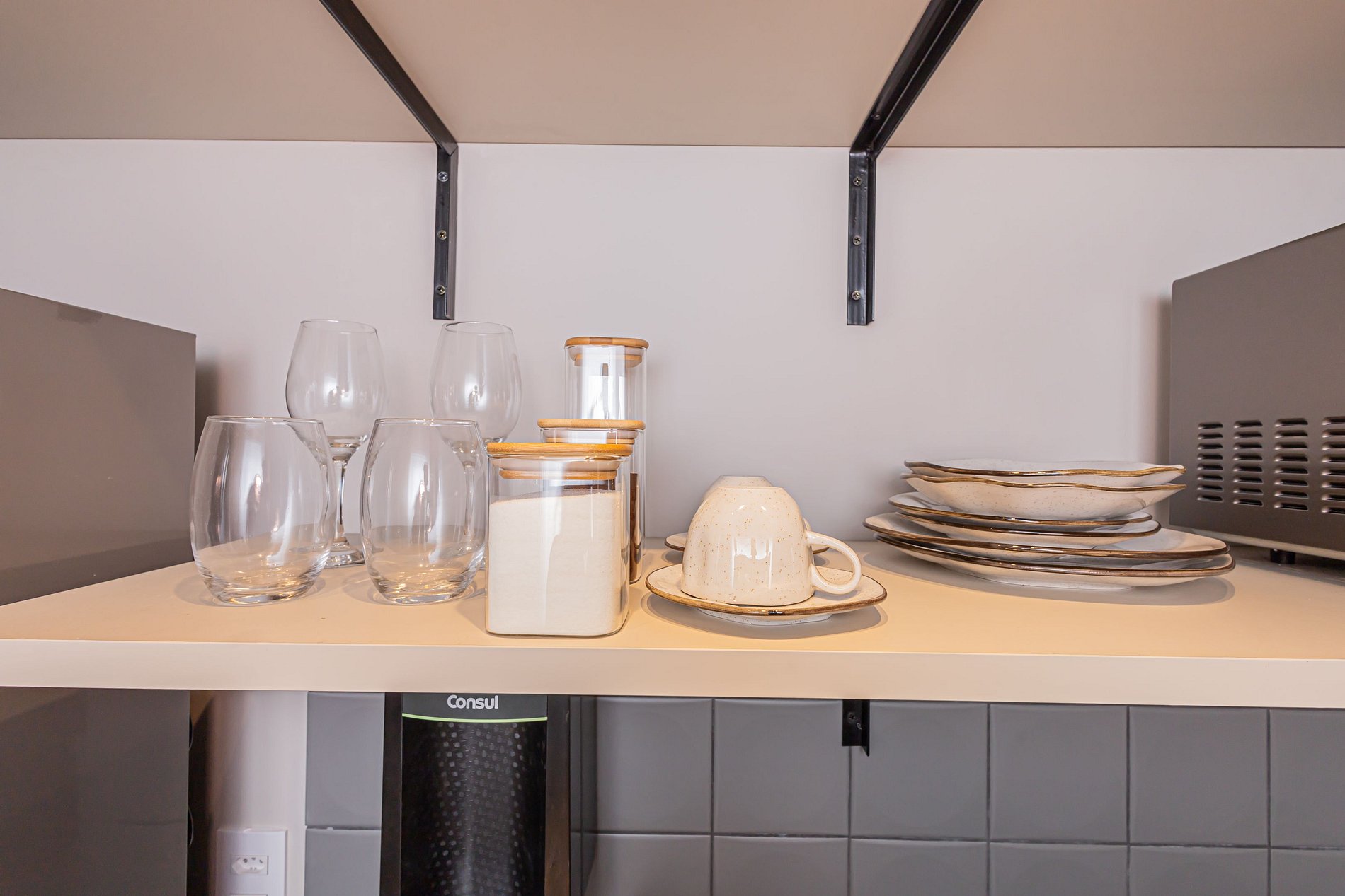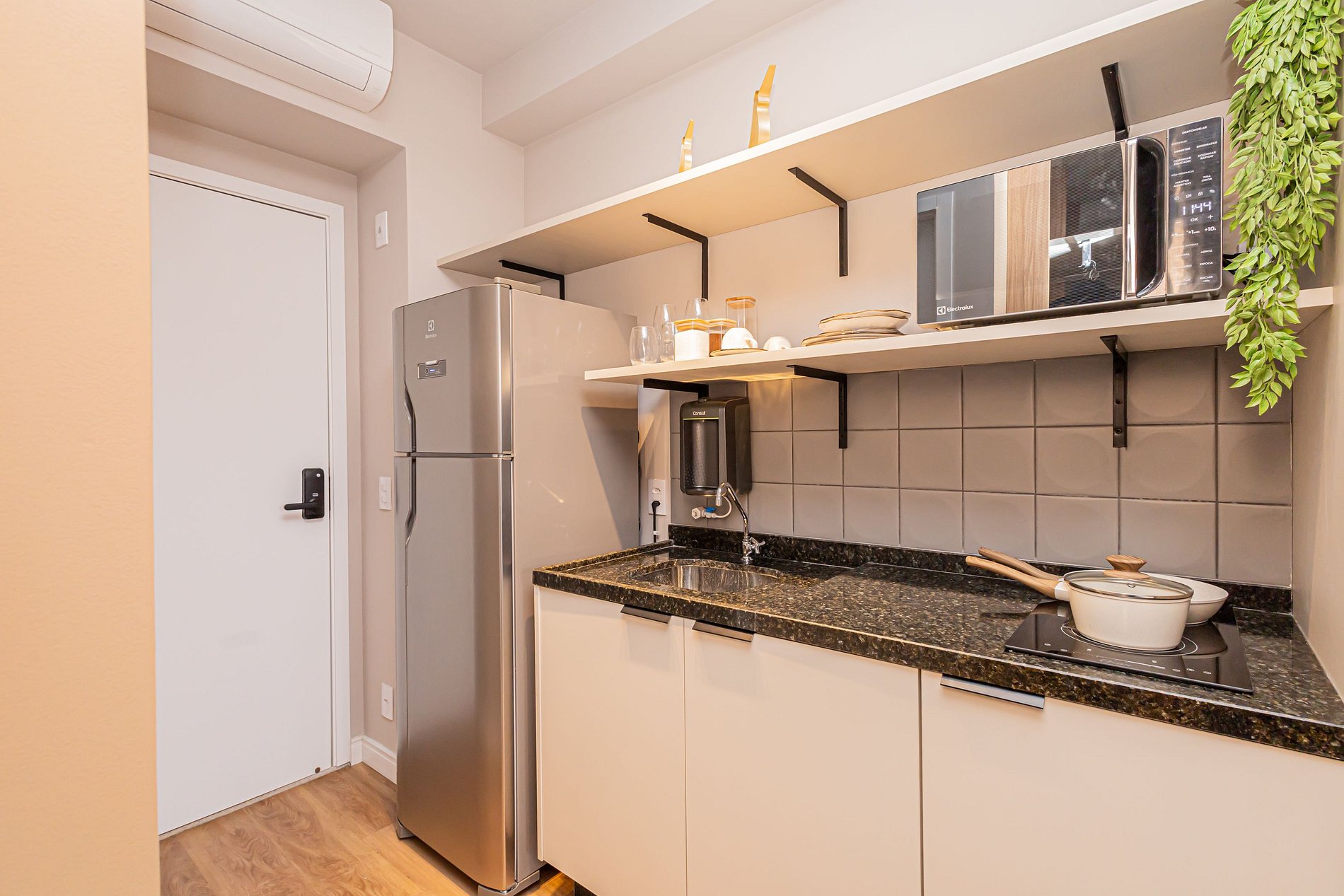 • Cozinha compacta e eficiente: Equipada com micro-ondas, fogão, geladeira e todos os utensílios necessários para preparar refeições rápidas e práticas.