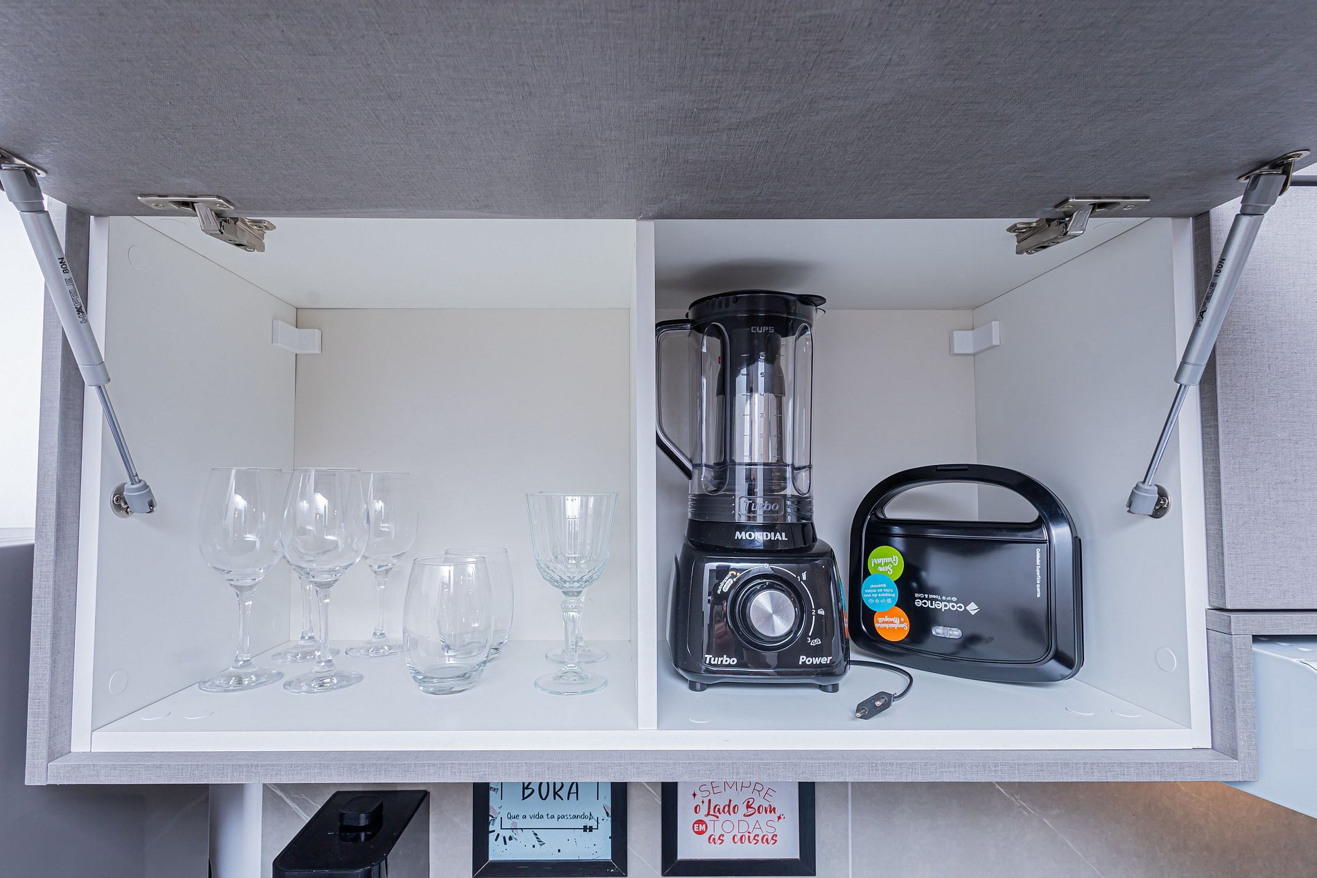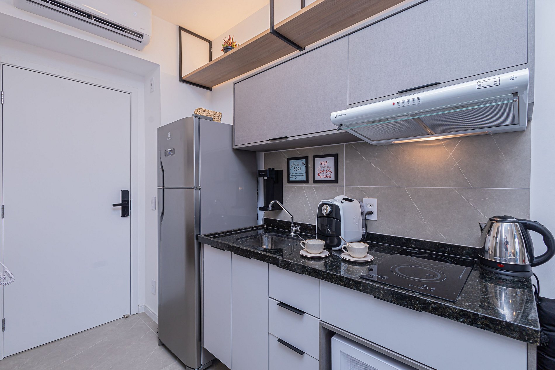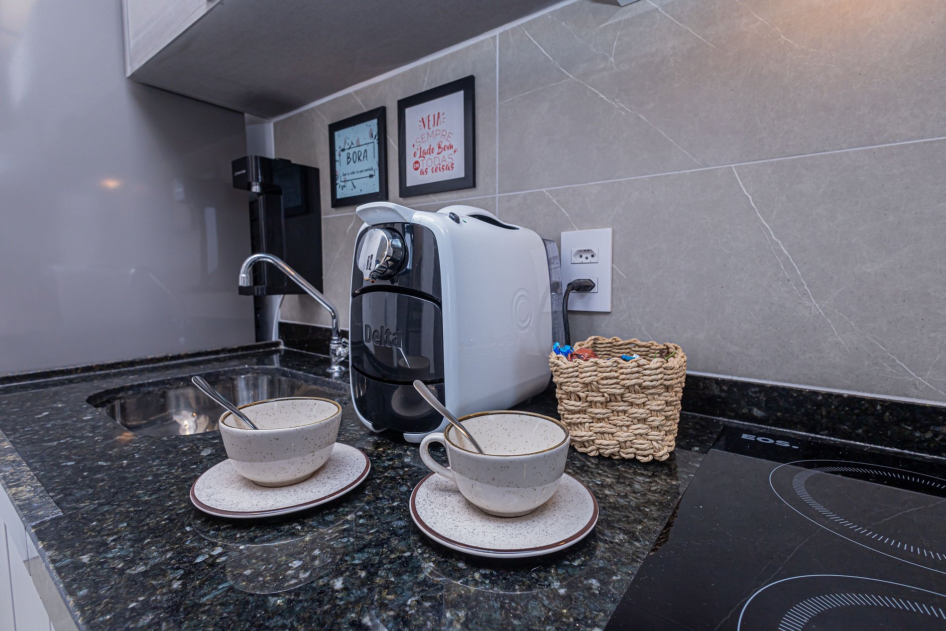 • Cozinha completa: A cozinha é totalmente equipada com micro-ondas, fogão, geladeira, cafeteira expressa, chaleira elétrica e panelas, além de todos os utensílios de cozinha necessários. Ideal para preparar refeições rápidas, um café da manhã completo ou aquele café especial para começar o dia.