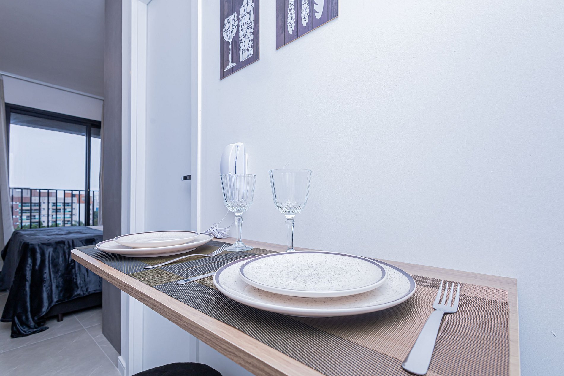 • Área de jantar: O estúdio oferece um espaço organizado para as refeições, com mesa de jantar, ideal para você desfrutar de suas refeições no próprio apartamento.