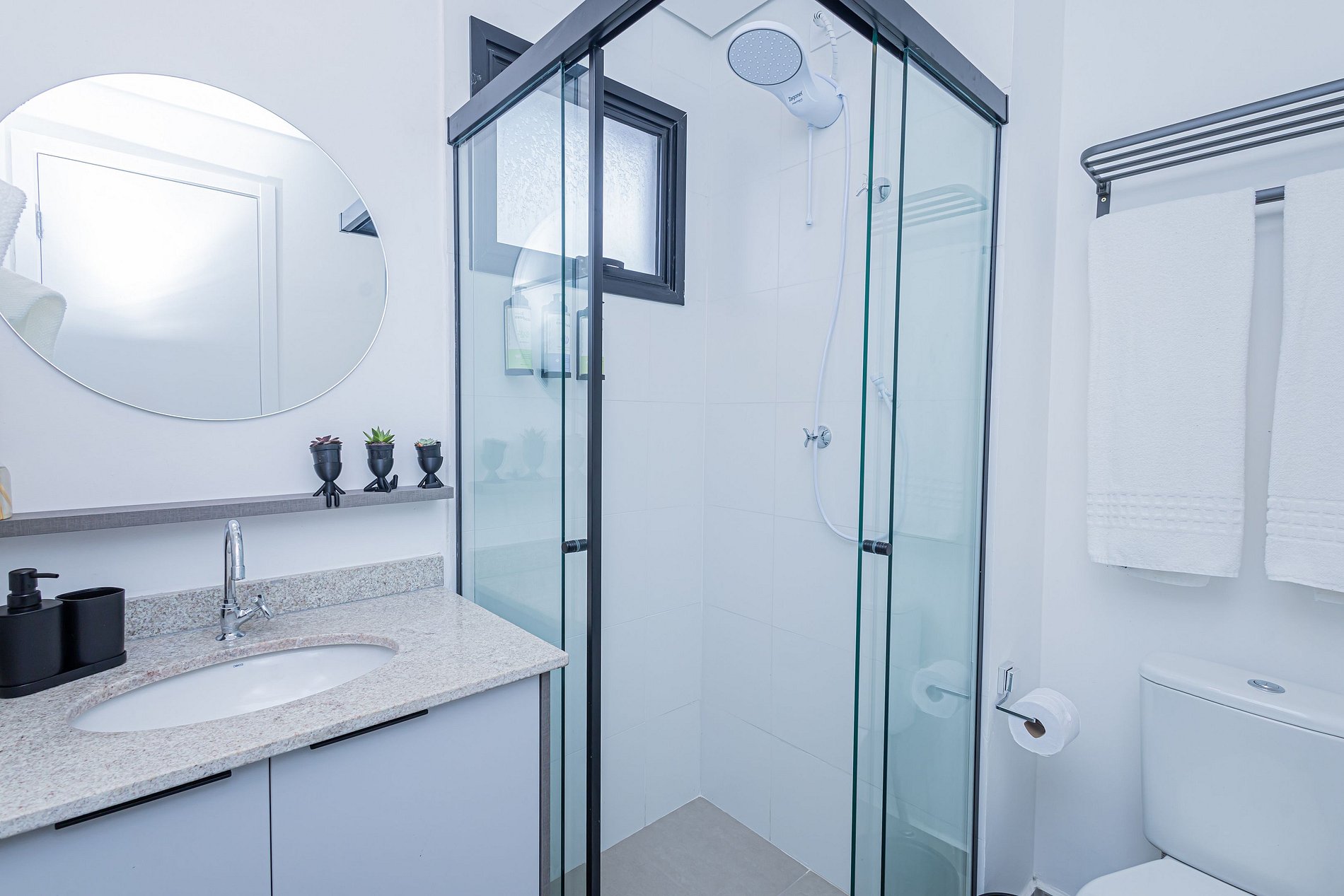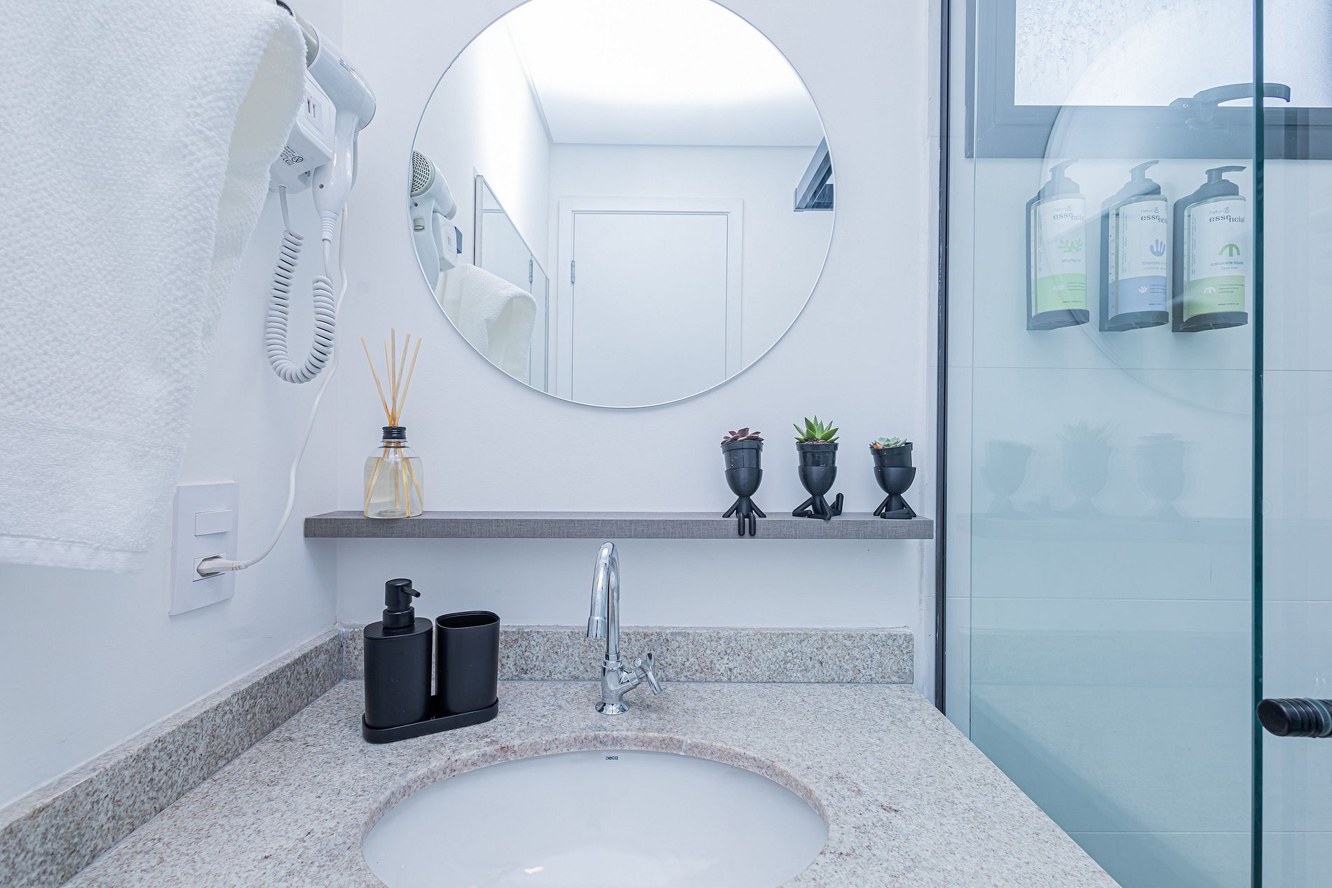 • Banheiro completo: Todas as amenidades de higiene estão à sua disposição, como shampoo, condicionador e sabonete líquido.