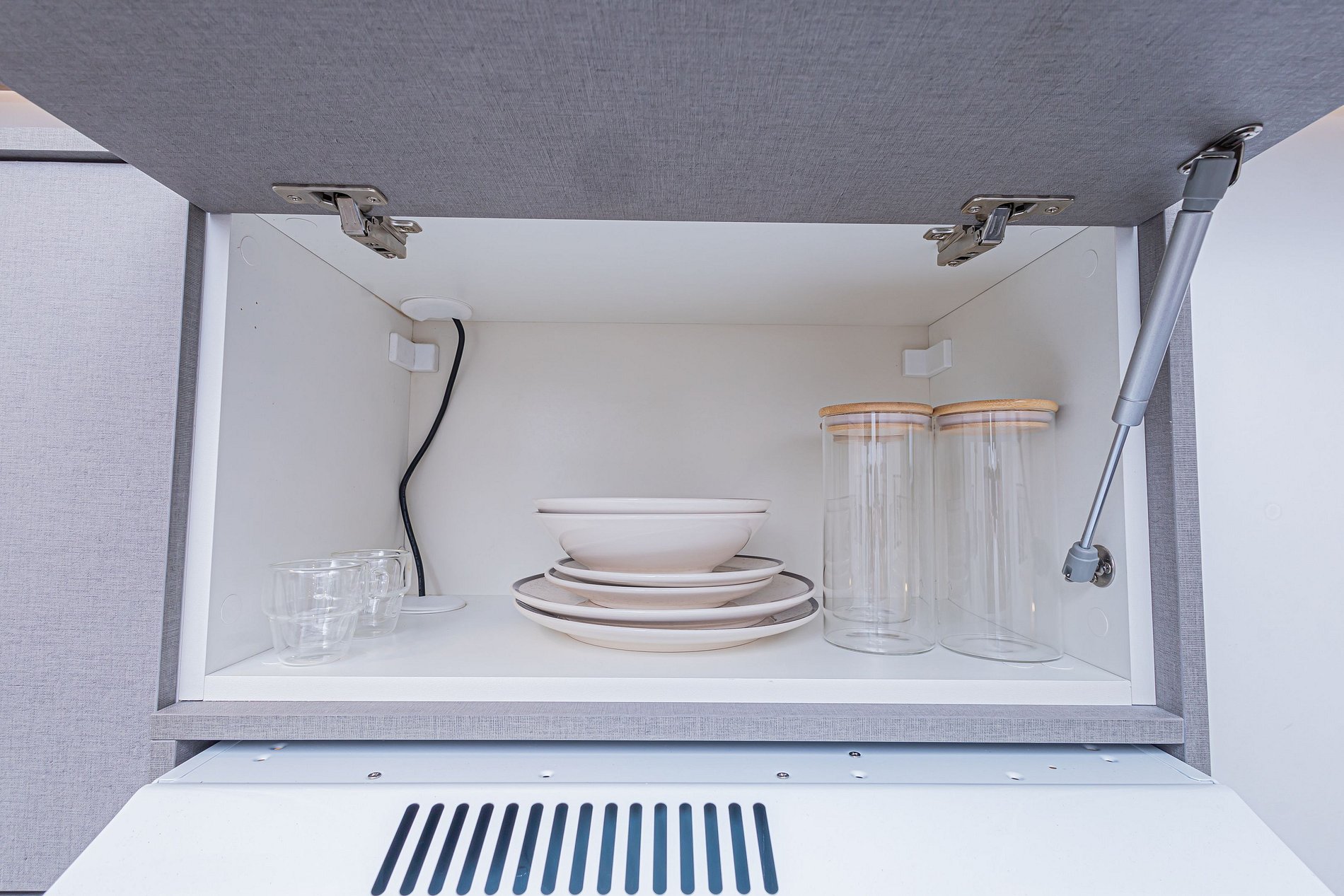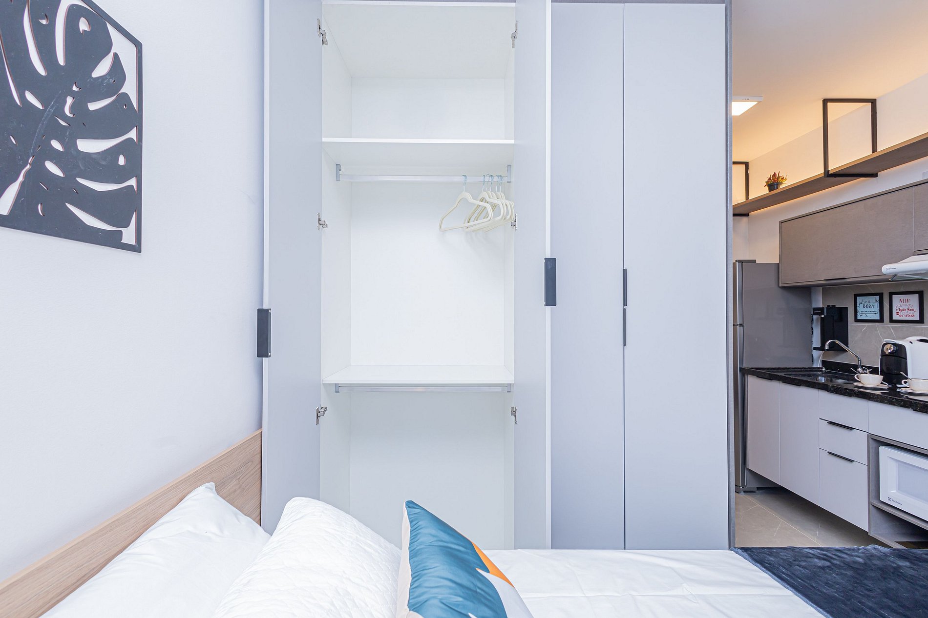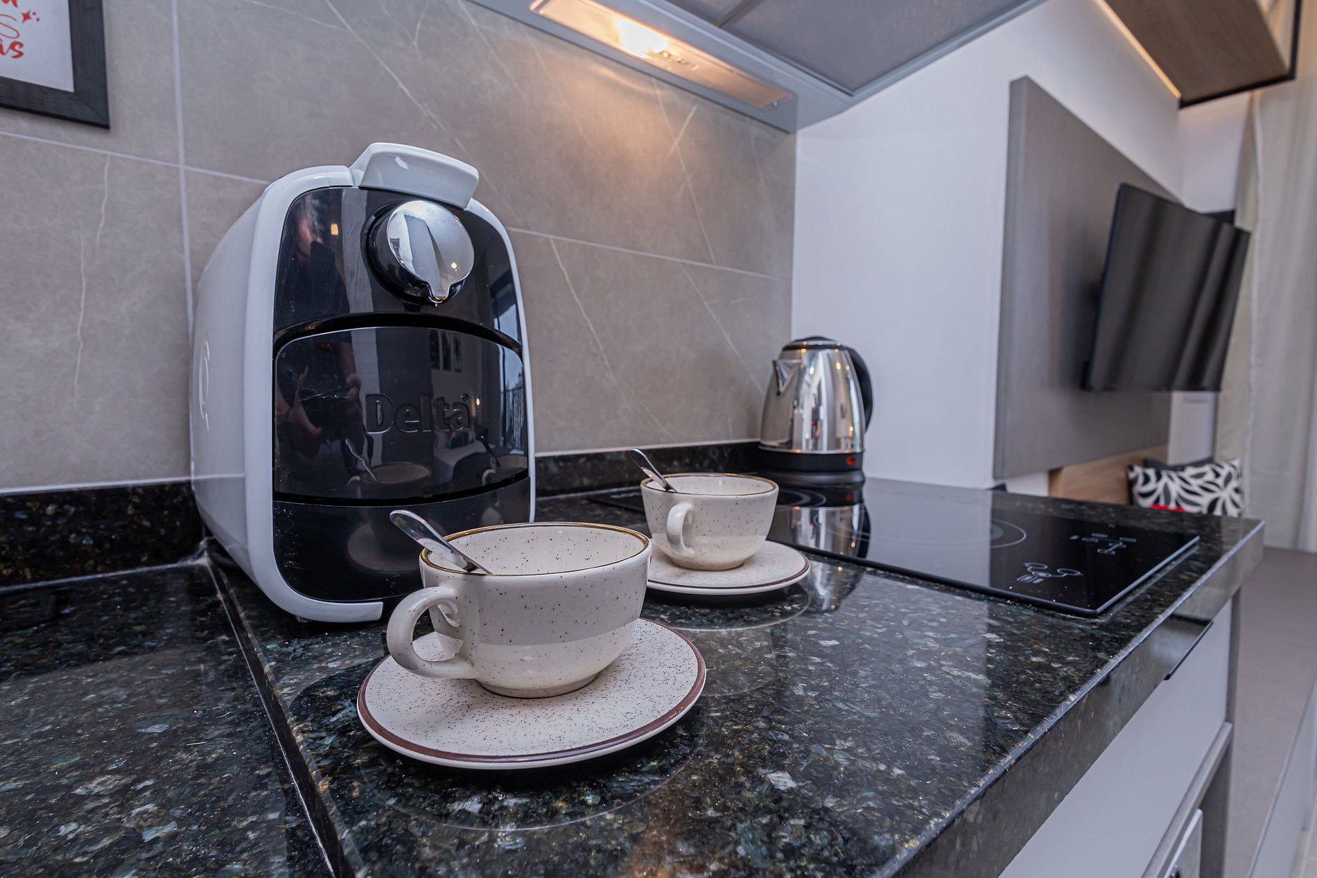• Cozinha completa: A cozinha é totalmente equipada com micro-ondas, fogão, geladeira, cafeteira expressa, chaleira elétrica e panelas, além de todos os utensílios de cozinha necessários. Ideal para preparar refeições rápidas, um café da manhã completo ou aquele café especial para começar o dia.