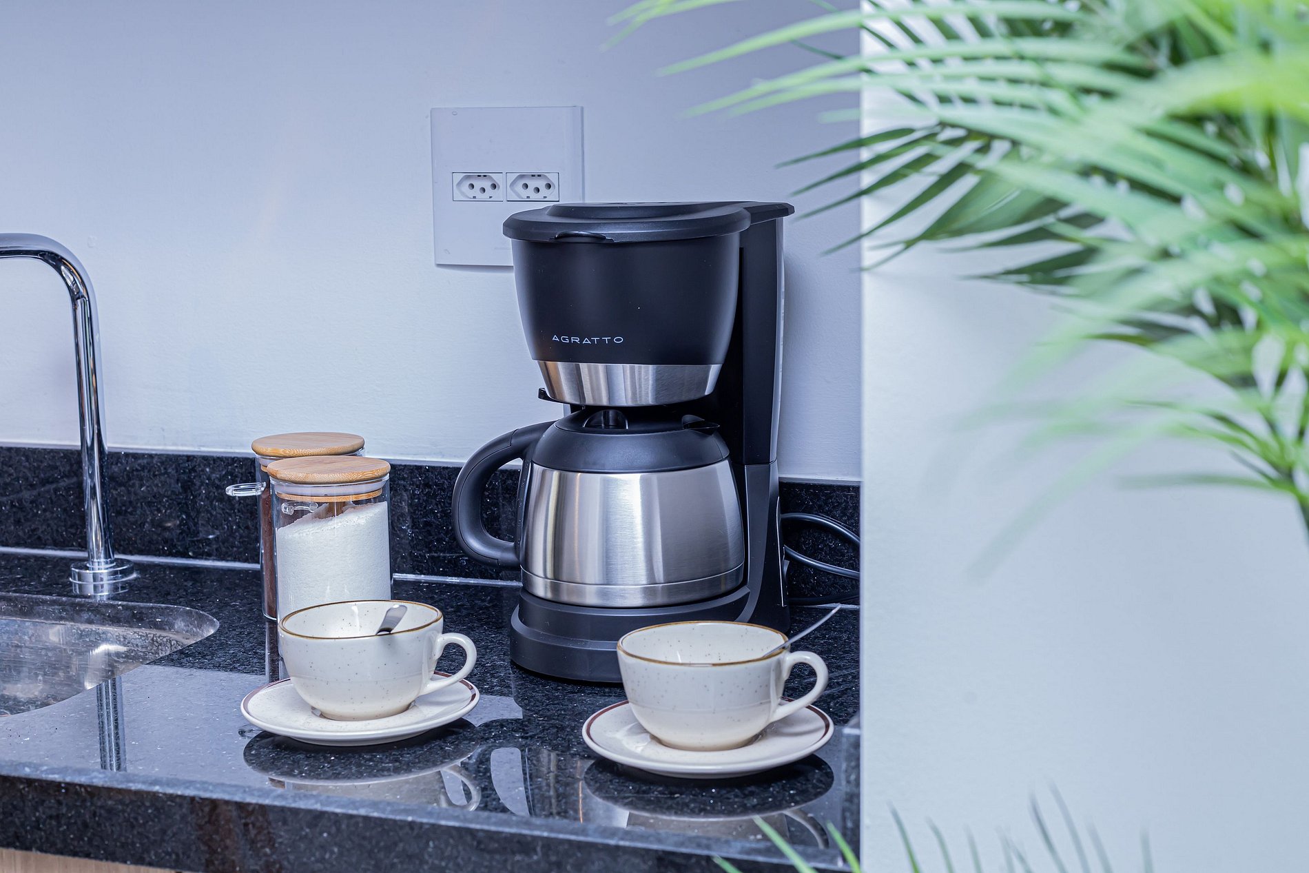 O condomínio oferece CAFÉ DA MANHÃ com padrão de hotelaria, servido todos os dias das 07h às 10h30, no 9º andar.
